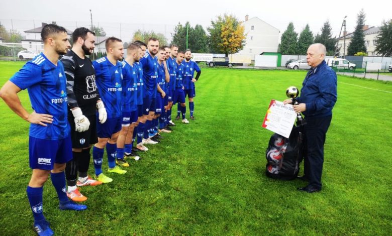 Przed niedzielnym spotkaniem z GKS Drwinia, które odbyło się na boisku w Woli Dębińskiej, Wójt Gminy Dębno Wiesław Kozłowski przekazał czek w wysokości 10 000,00 zł, pamiątkowy puchar za awans do V ligi oraz worek z piłkami.