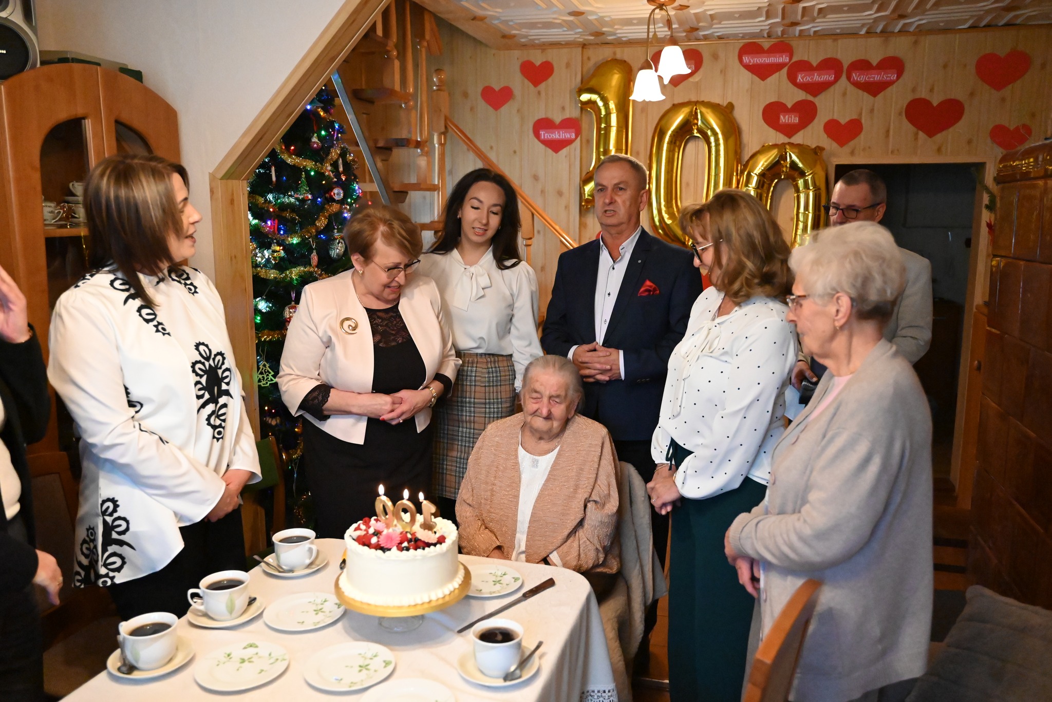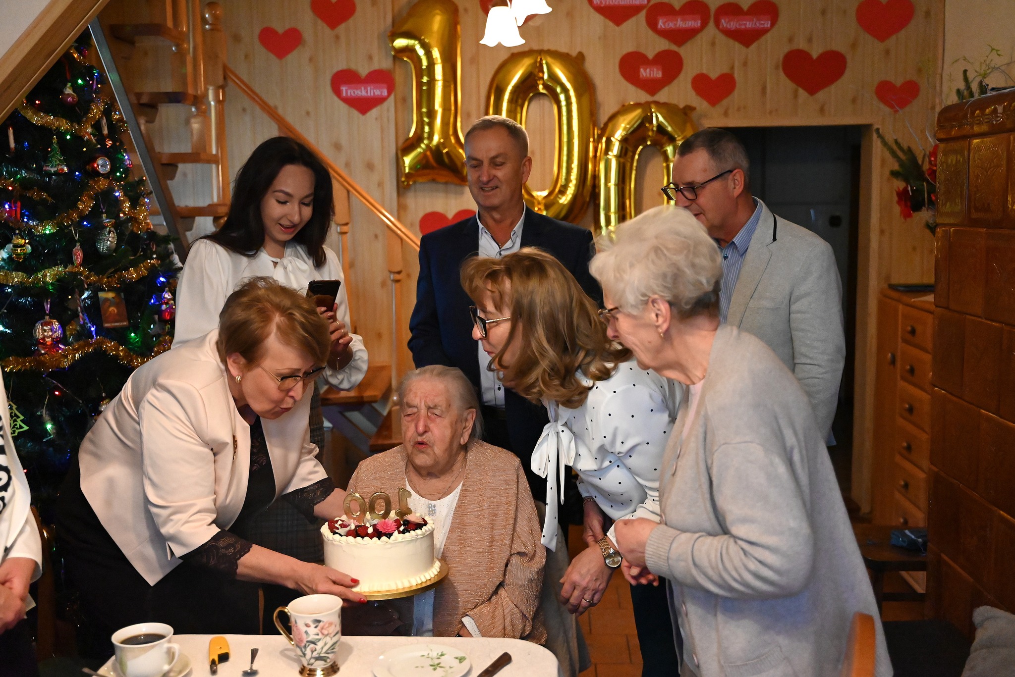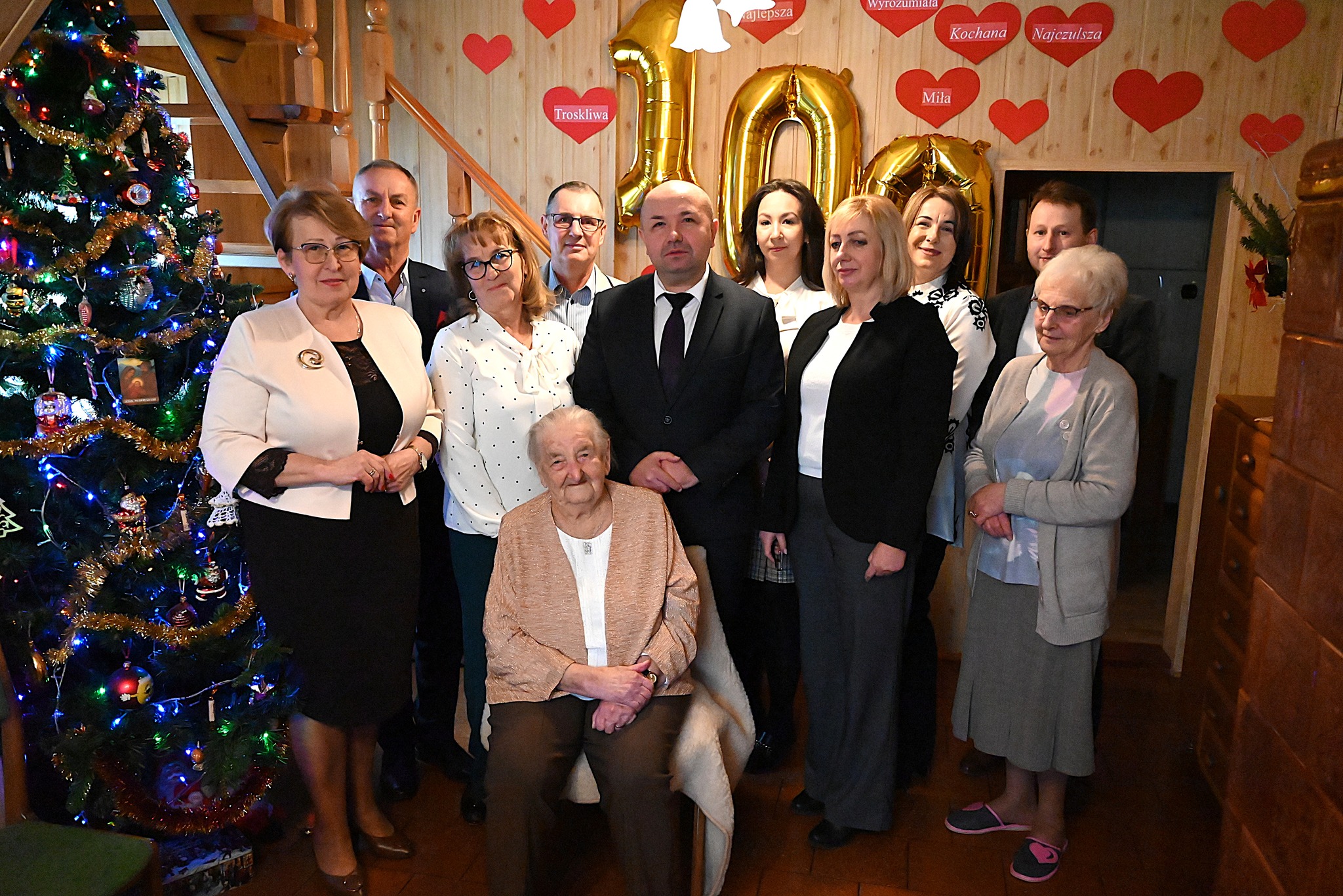 Pani Janina urodziła się 23 stycznia 1926 roku. Przyszło jej żyć w trudnych czasach, spowodowanych m.in. II wojną światową. Pomimo tego założyła szczęśliwą i kochającą się rodzinę. Jubilatka, jak na swój wiek, jest w naprawdę dobrej formie i tryska pozytywną energią, której mogłyby jej pozazdrościć dużo młodsze osoby. Wciąż aktywnie spędza czas – do dzisiaj szyje zimowe skarpety, które trafiają do rodziny, przynosząc bliskim radość i ciepło.