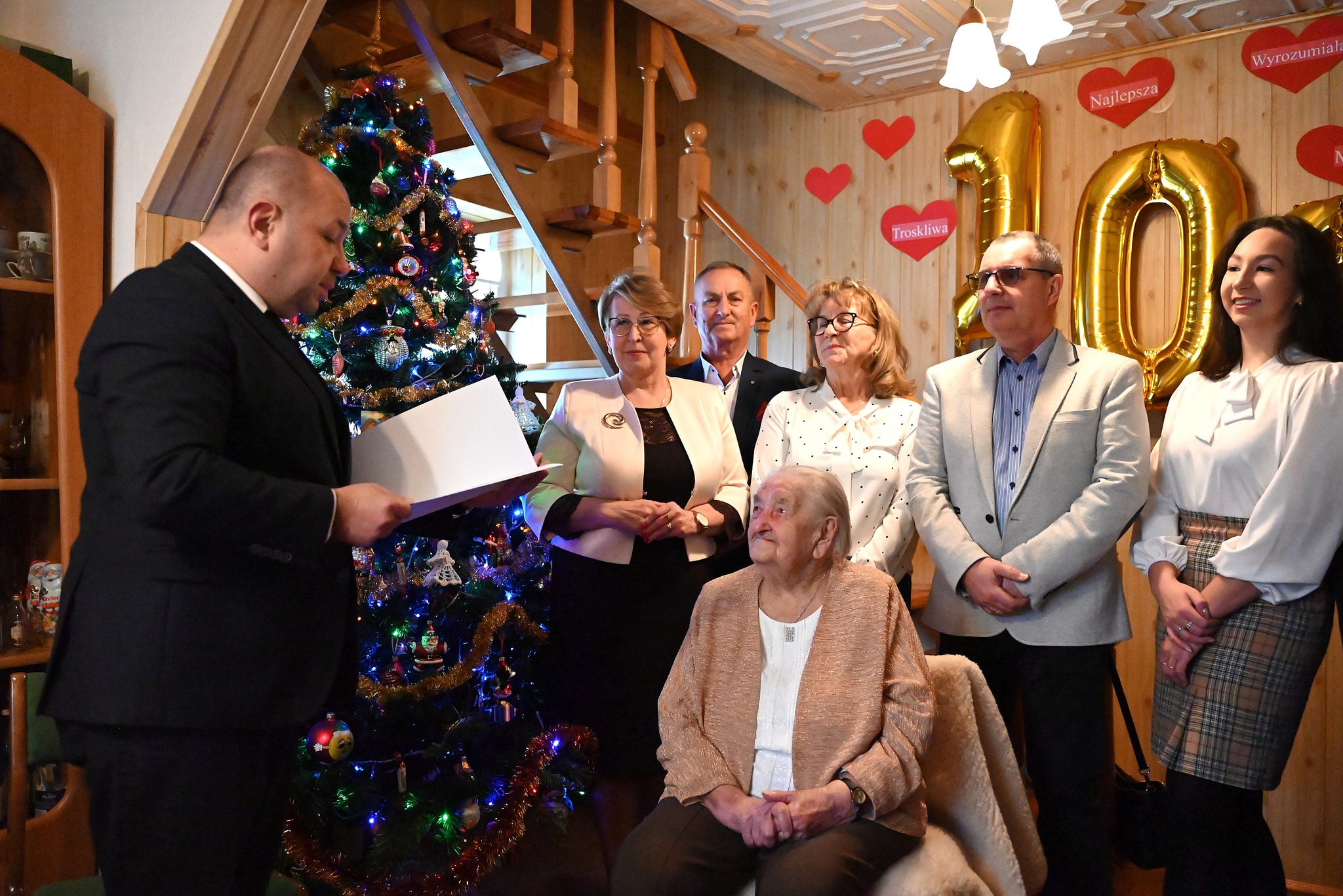Wójt Gminy Rzezawa Zbigniew Biernat oraz Kierownik Urzędu Stanu Cywilnego Dorota Wągroda, w imieniu własnym oraz całej społeczności Gminy Rzezawa gratulowali czcigodnej Jubilatce osiągnięcia tak pięknego wieku oraz życzyli jej dużo zdrowia, szczęścia, zadowolenia, Bożej Opatrzności i wszelkiej pomyślności na kolejne lata życia. Przekazali Pani Janinie również okolicznościowe listy od Prezesa Rady Ministrów oraz Wojewody Małopolskiego. Jubilatkę odwiedziła także Kierownik Inspektoratu ZUS w Bochni Renata Fortuna, która również złożyła Pani Janinie serdeczne życzenia z okazji tak wyjątkowego jubileuszu.
