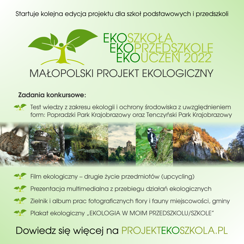 Gminny Ośrodek Kultury w Borzęcinie i Zespół Szkolno-Przedszkolny im. Bł. Karoliny Kózkówny w Borzęcinie Dolnym organizują w roku szkolnym 2021/2022: MAŁOPOLSKI PROJEKT EKOLOGICZNY EKOSZKOŁA, EKOPRZEDSZKOLE, EKOUCZEŃ 2022. Partnerem projektu jest Kuratorium Oświaty w Krakowie.