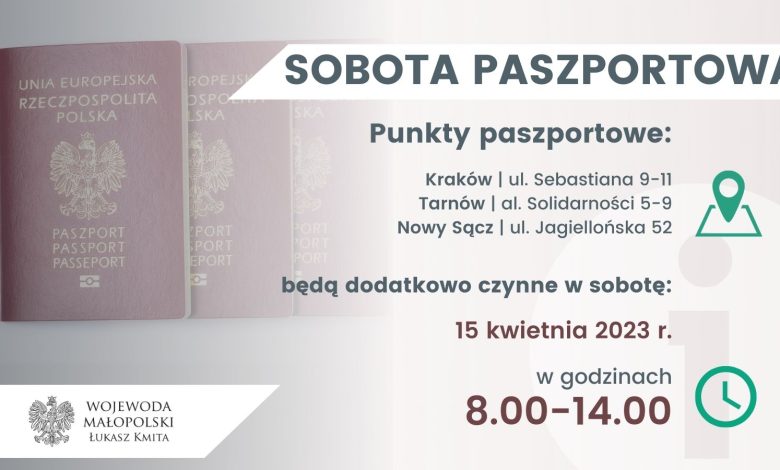 W sobotę 15 kwietnia Oddziały Paszportowe w Krakowie przy ul. św. Sebastiana, w delegaturze Małopolskiego Urzędu Wojewódzkiego w Tarnowie (al. Solidarności 5-9) oraz Nowym Sączu (ul. Jagiellońska 52) będą czynne w godz. od 8:00 do 14:00.