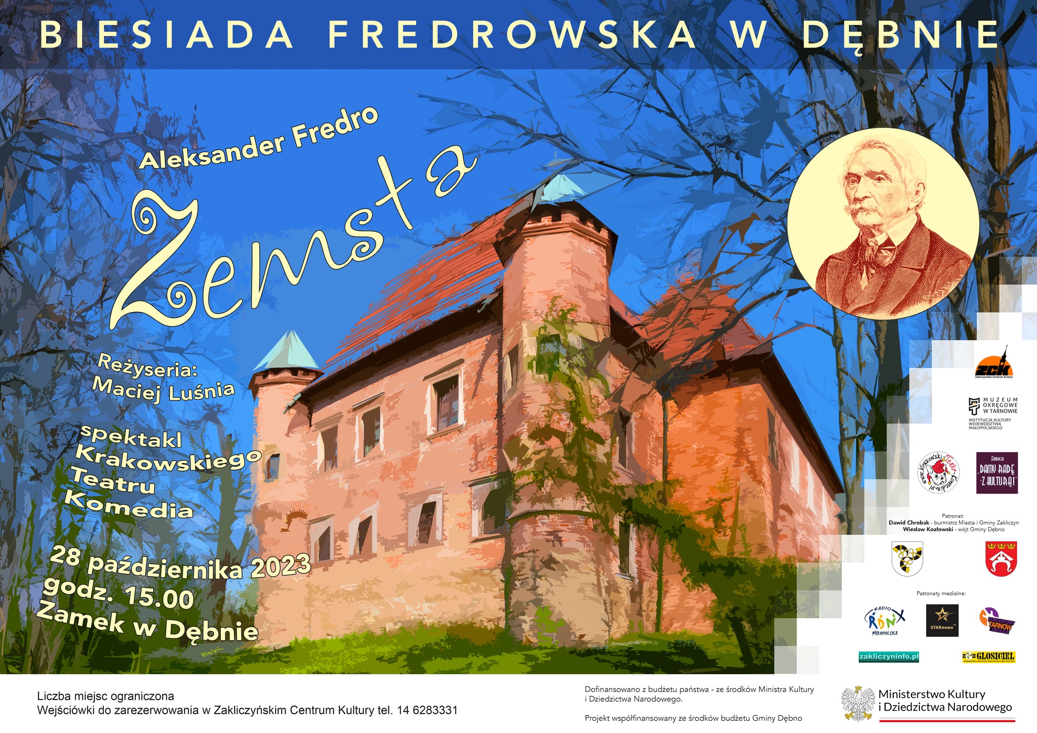 Projekt „Biesiada Fredrowska w Dębnie” realizowany jest w ramach Roku Aleksandra hr. Fredry – bo rok 2023 jest rokiem tego znakomitego polskiego twórcy.