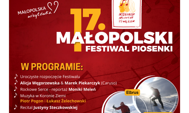 22 maja rozpocznie się 17. Małopolski Festiwal Piosenki „Integracja malowana dźwiękiem”. Organizatorzy zapowiadają wiele niespodzianek. Jedno jest pewne – utwór „Caruso” po raz pierwszy na żywo zaśpiewają Alicja Węgorzewska i Marek Piekarczyk. Zaplanowany jest także recital Justyny Steczkowskiej. W tym dniu muzyka dosięgnie Korony Ziemi – co kryje się pod tym tajemniczym tytułem?