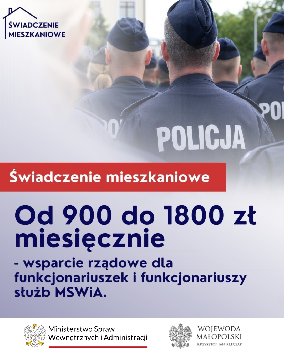 – Nowy dodatek mieszkaniowy dla służb mundurowych będzie wynosił od 900 do 1800 zł. To nowe rozwiązania, wprowadzane przez rząd na wzór modelu stosowanego w Siłach Zbrojnych RP. Reforma obejmie Policję, Straż Graniczną, Państwową Straż Pożarną oraz Służbę Ochrony Państwa. Ma zacząć obowiązywać od 1 lipca tego roku. Stawiamy na dalsze wsparcie i profesjonalizację służb mundurowych. (…) Co istotne, jest to rozwiązanie wypracowane po konsultacjach z policjantami i związkami zawodowymi – mówi wojewoda małopolski Krzysztof Jan Klęczar.