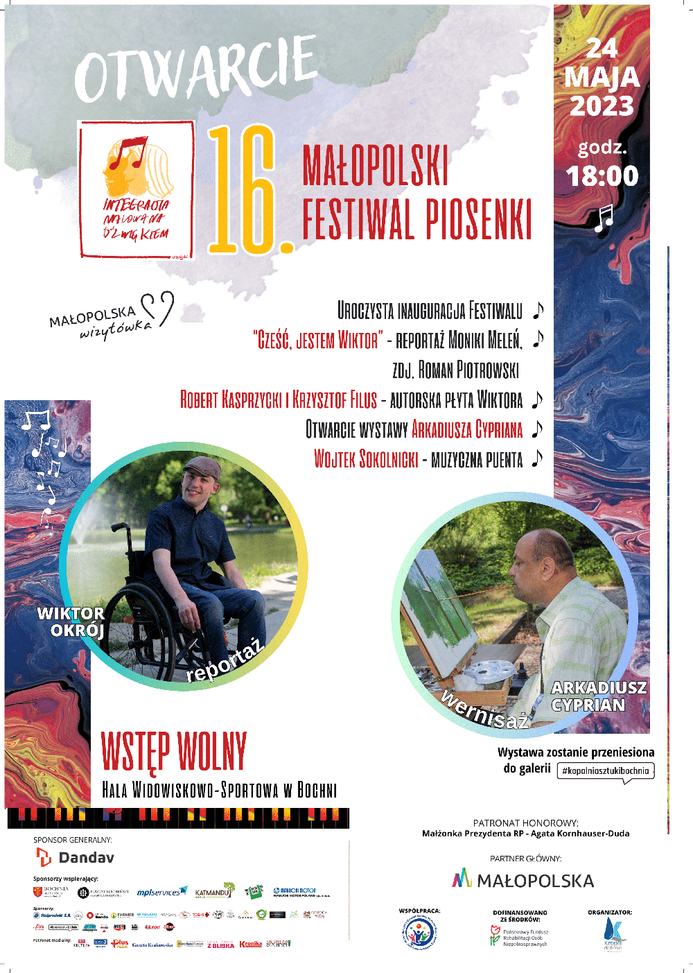 O godz. 18.00 w Hali Widowiskowo Sportowej w Bochni obejrzymy reportaż Moniki Meleń „Cześć, jestem Wiktor”. Opowieść o młodym mężczyźnie z mózgowym porażeniem dziecięcym, który mówi o sobie, że pisze, gra, komponuje i…cieszy się życiem. Mimo trudności wynikających z niepełnosprawności ambitnie dąży do spełnienia swoich marzeń, pojawia się w różnych miejscach i dzieli się swoimi talentami, a także wielką siłą i radością życia. Podróżuje, pisze wiersze i tworzy muzykę.