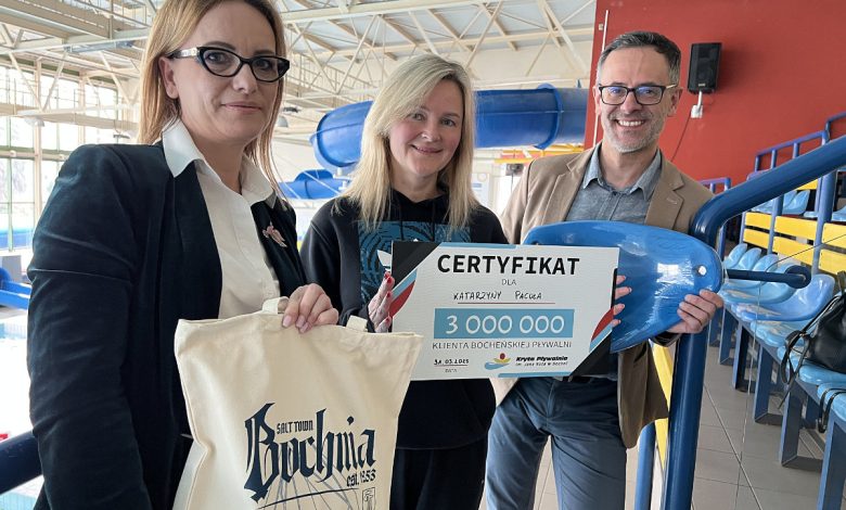 Była nią, mieszkająca na co dzień w Bochni, Pani Katarzyna Pacuła, której serdecznie gratulujemy. Pani Kasia odwiedza nas regularnie co 2 – 3 dni, jakież więc było jej zaskoczenie, kiedy po poniedziałkowym treningu czekała na nią osobiście Burmistrz Bochni – Pani Magdalena Łacna, która w towarzystwie dyrektora Krytej Pływalni im. Jana Kota – Pana Roberta Hołdy, wręczyła naszej Klientce zestaw prezentów wraz z okolicznościowym certyfikatem.