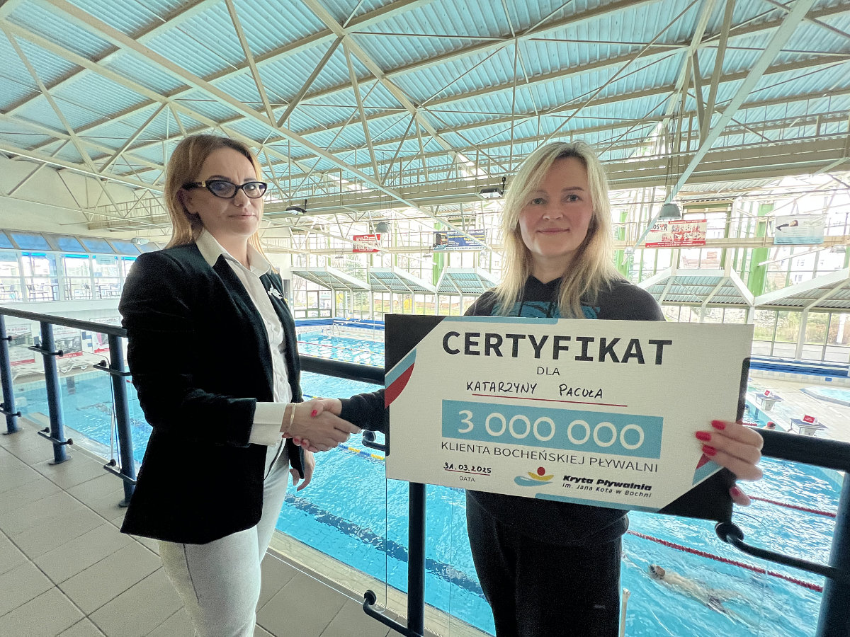 Była nią, mieszkająca na co dzień w Bochni, Pani Katarzyna Pacuła, której serdecznie gratulujemy. Pani Kasia odwiedza nas regularnie co 2 – 3 dni, jakież więc było jej zaskoczenie, kiedy po poniedziałkowym treningu czekała na nią osobiście Burmistrz Bochni – Pani Magdalena Łacna, która w towarzystwie dyrektora Krytej Pływalni im. Jana Kota – Pana Roberta Hołdy, wręczyła naszej Klientce zestaw prezentów wraz z okolicznościowym certyfikatem.