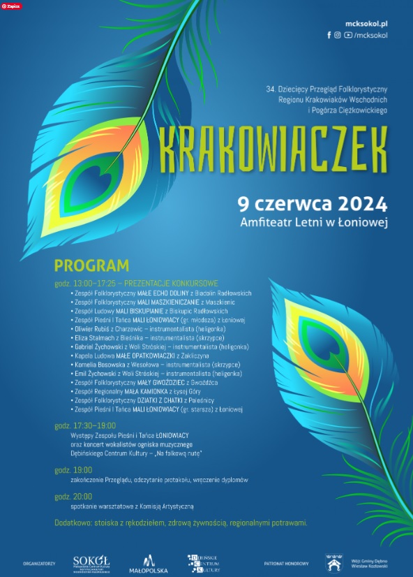 34. edycja KRAKOWIACZKA – Dziecięcego Przeglądu Folklorystycznego Regionu Krakowiaków Wschodnich i Pogórza Ciężkowickiego odbędzie się 9 czerwca 2024 r, w Amfiteatrze letnim w Łoniowej.