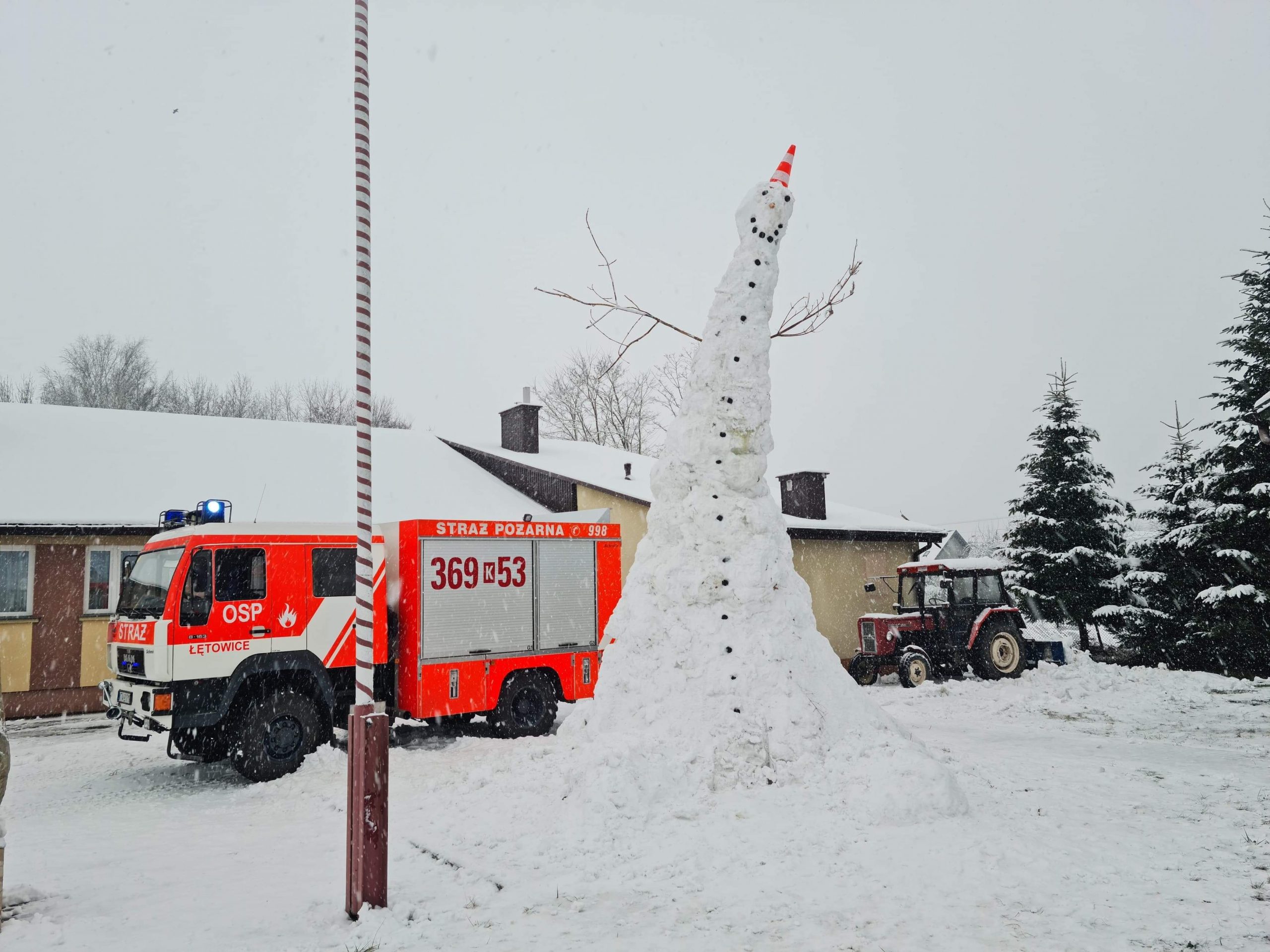 Po ostatnich opadach śniegu druhowie z OSP Łętowice (Gmina Wierzchosławice / Powiat Tarnowski) zebrali się jak zawsze do odśnieżania podjazdu przed garażem dla samochodów strażackich oraz placu wokół remizy. Część śniegu nie trafiła jednak na pryzmy, ale zamieniła się w pięknego bałwana. Strażacki bałwan jest bardzo okazały. Ma 7 metrów wysokości i stylowy kapelusz zrobiony z pachołka drogowego. Strażacy planują wybudować mu „kolegę”, zwłaszcza że śniegu nie brakuje.