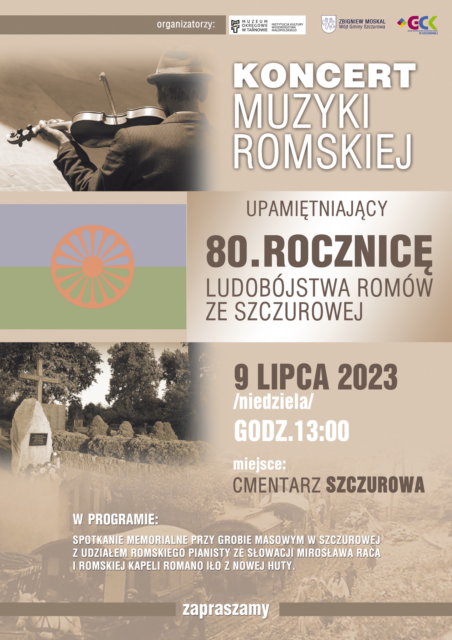 13:00 – Spotkanie memorialne przy grobie masowym w Szczurowej z udziałem romskiego pianisty ze Słowacji Mirosława Rača i romskiej kapeli Romano Iło z Nowej Huty.