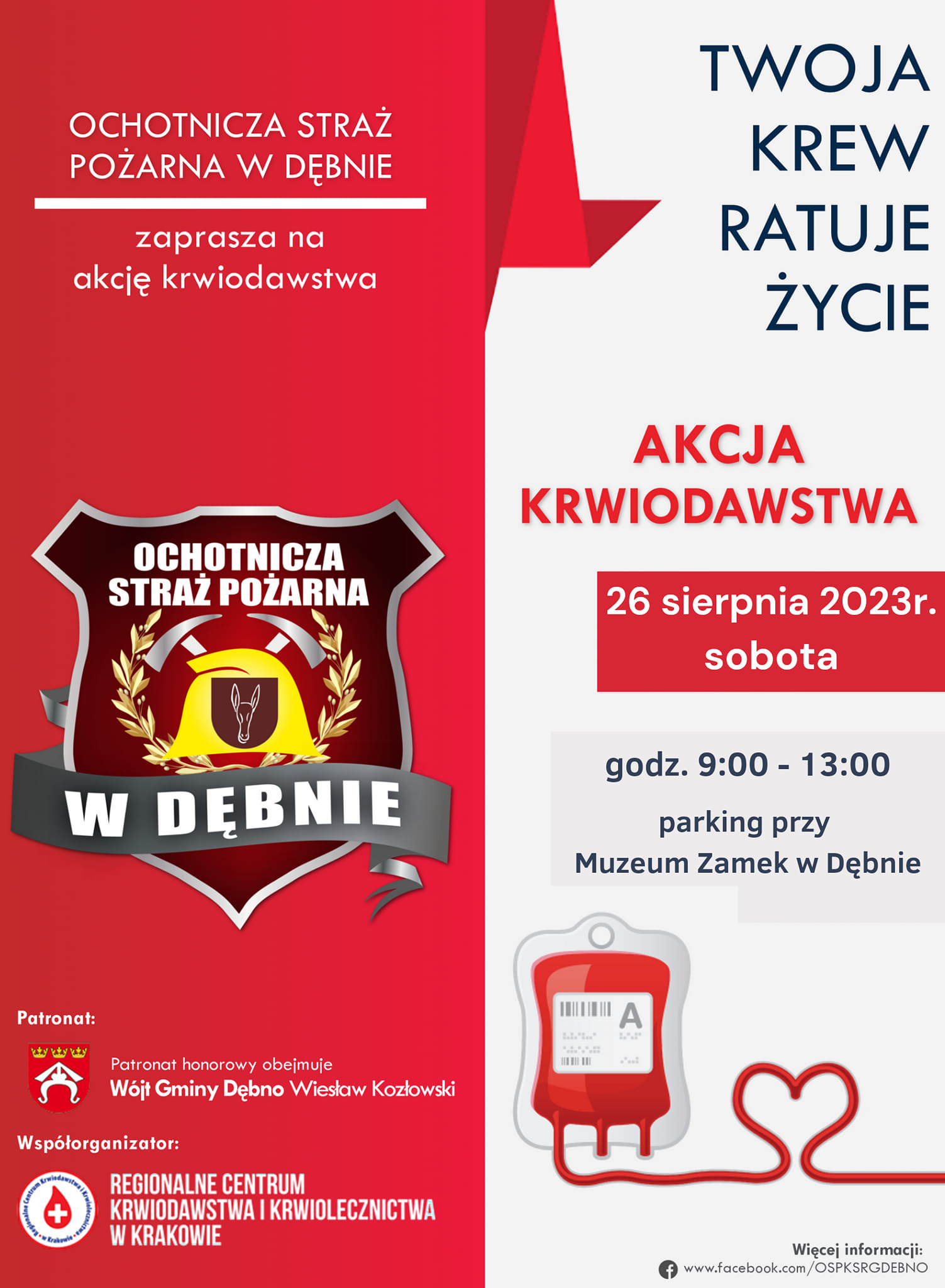 Już w najbliższą sobotę 26 sierpnia 2023 r. druhowie z OSP Dębno organizują kolejną akcję krwiodawstwa. Tym razem krwiobus z Regionalnego Centrum Krwiodawstwa i Krwiolecznictwa w Krakowie zaparkuje na parkingu przed Zamkiem w Dębnie. Akcja potrwa od godz. 9.00 do 13.00.
