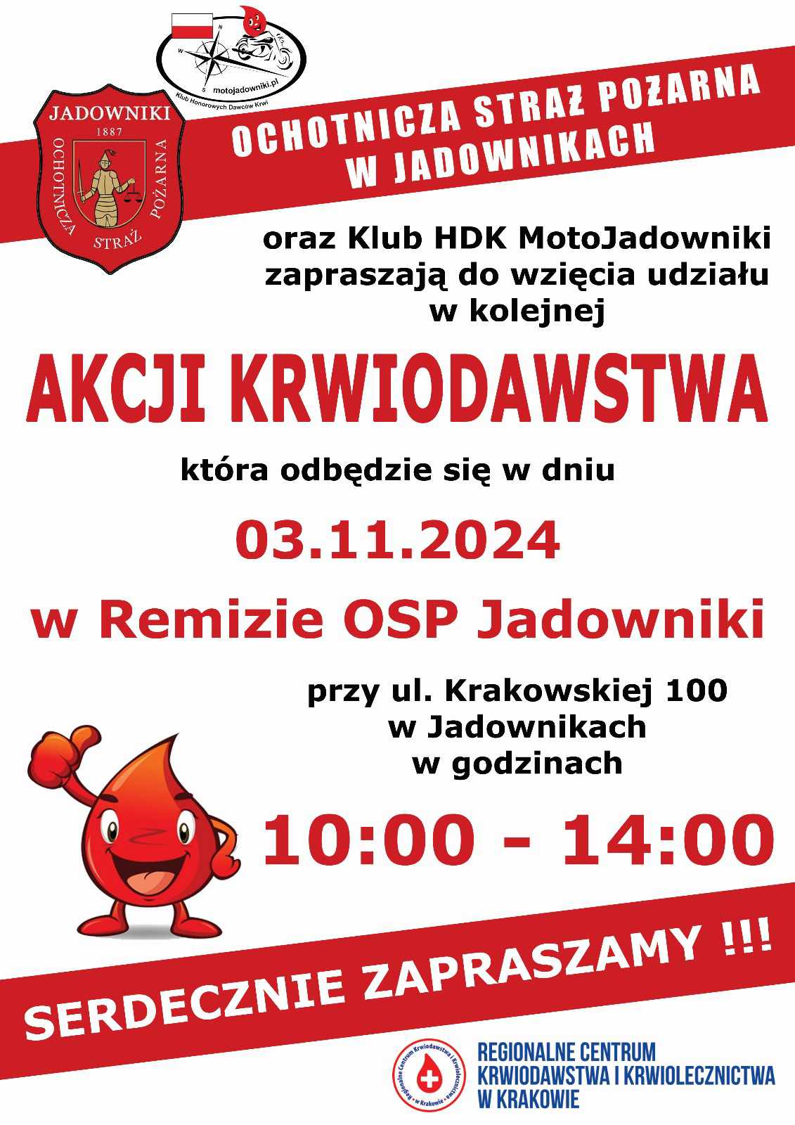 Ochotnicza Straż Pożarna w Jadownikach oraz Klub HDK MotoJadowniki serdecznie zapraszają wszystkich ludzi dobrej woli na akcję krwiodawstwa, która odbędzie się w niedzielę 3 listopada 2024 r. od godziny 10:00 do 14:00 w remizie OSP Jadowniki.