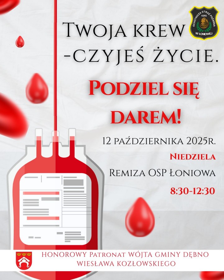 W niedzielę 12 października 2025 roku w Remizie Ochotniczej Straży Pożarnej w Łoniowej odbędzie się akcja krwiodawstwa pod hasłem „Twoja krew – czyjeś życie. Podziel się darem!”. Krew będzie można oddać w godzinach 8:30-12:30.