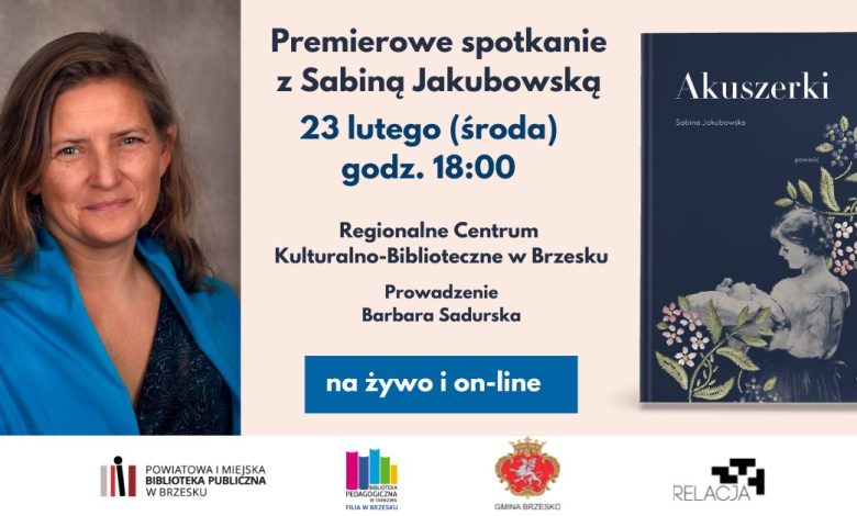 Powiatowa i Miejska Biblioteka Publiczna w Brzesku, Biblioteka Pedagogiczna w Tarnowie. Filia w Brzesku oraz Grupa Wydawnicza Relacja zapraszają na spotkanie autorskie z Sabiną Jakubowską połączone z premierą jej najnowszej powieści „Akuszerki”.
