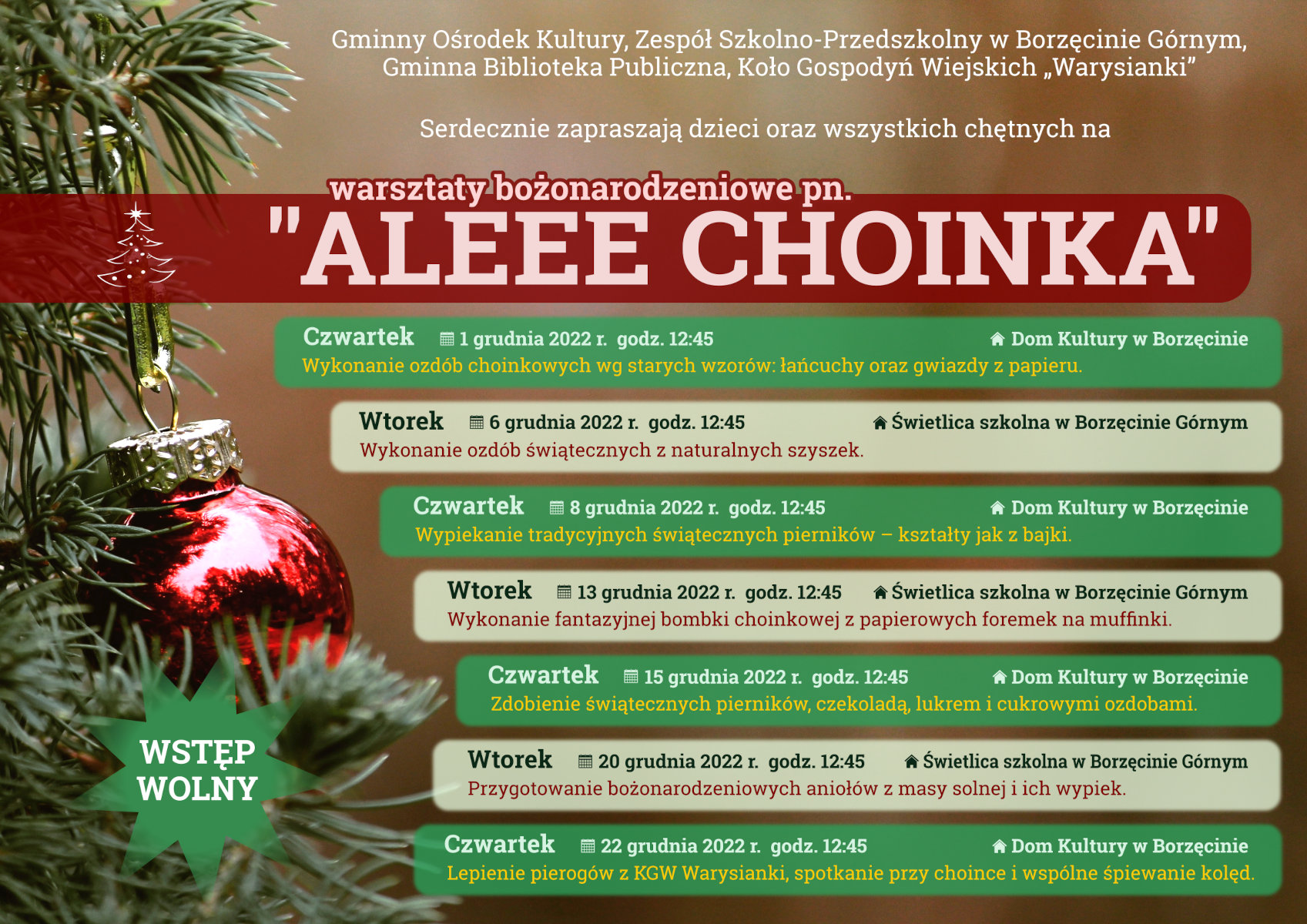 Gminny Ośrodek Kultury w Borzęcinie, Zespół Szkolno-Przedszkolny w Borzęcinie Górnym, Gminna Biblioteka Publiczna w Borzęcinie oraz Koło Gospodyń Wiejskich „Warysianki” serdecznie zapraszają dzieci, oraz wszystkich chętnych na warsztaty bożonarodzeniowe ph. „ALEEE CHOINKA”.