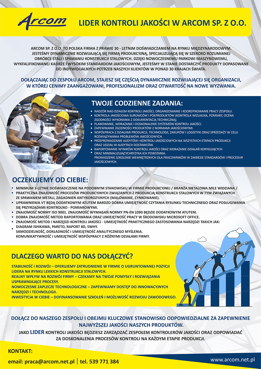LIDER KONTROLI JAKOŚCI W ARCOM SP. Z O.O.