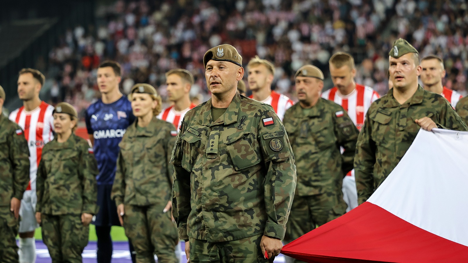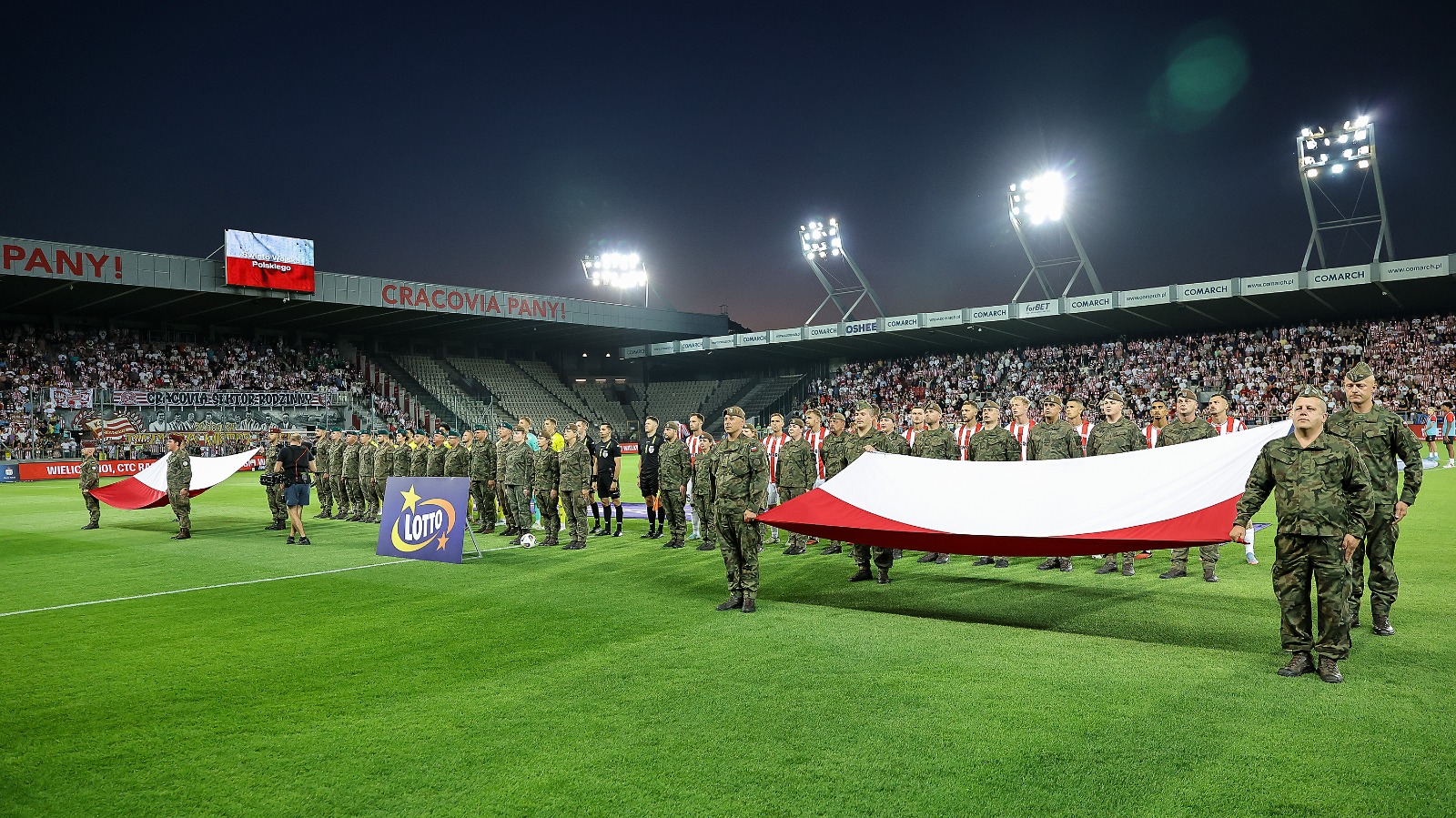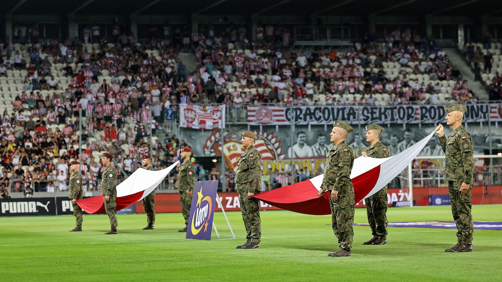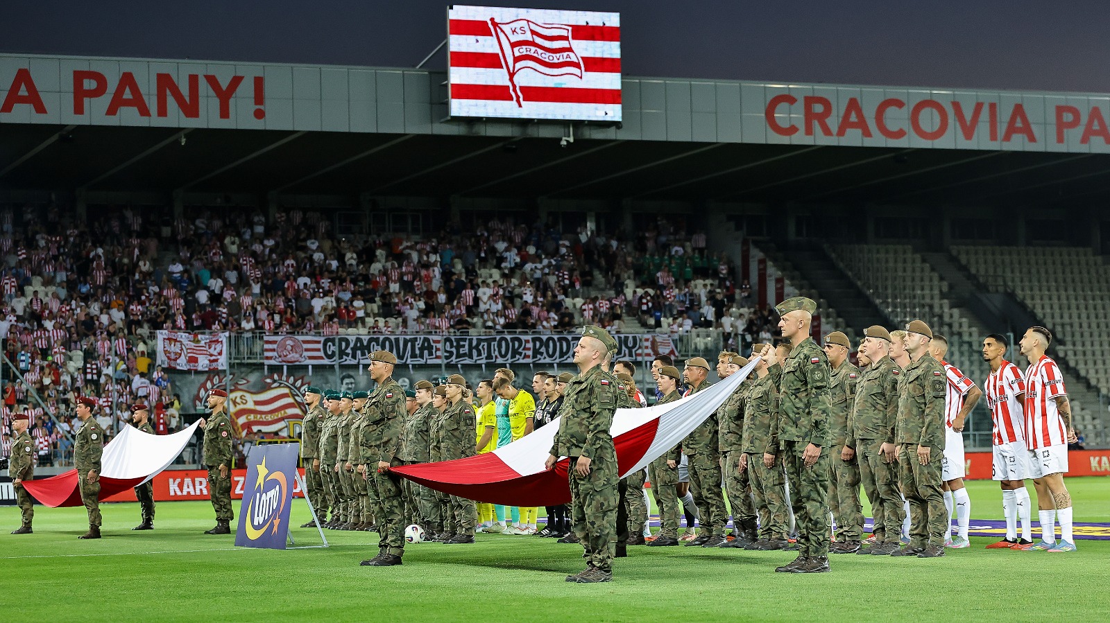 Barwy narodowe i hymn Polski przed meczem Cracovii z Widzewem – hołd bohaterom Bitwy Warszawskiej