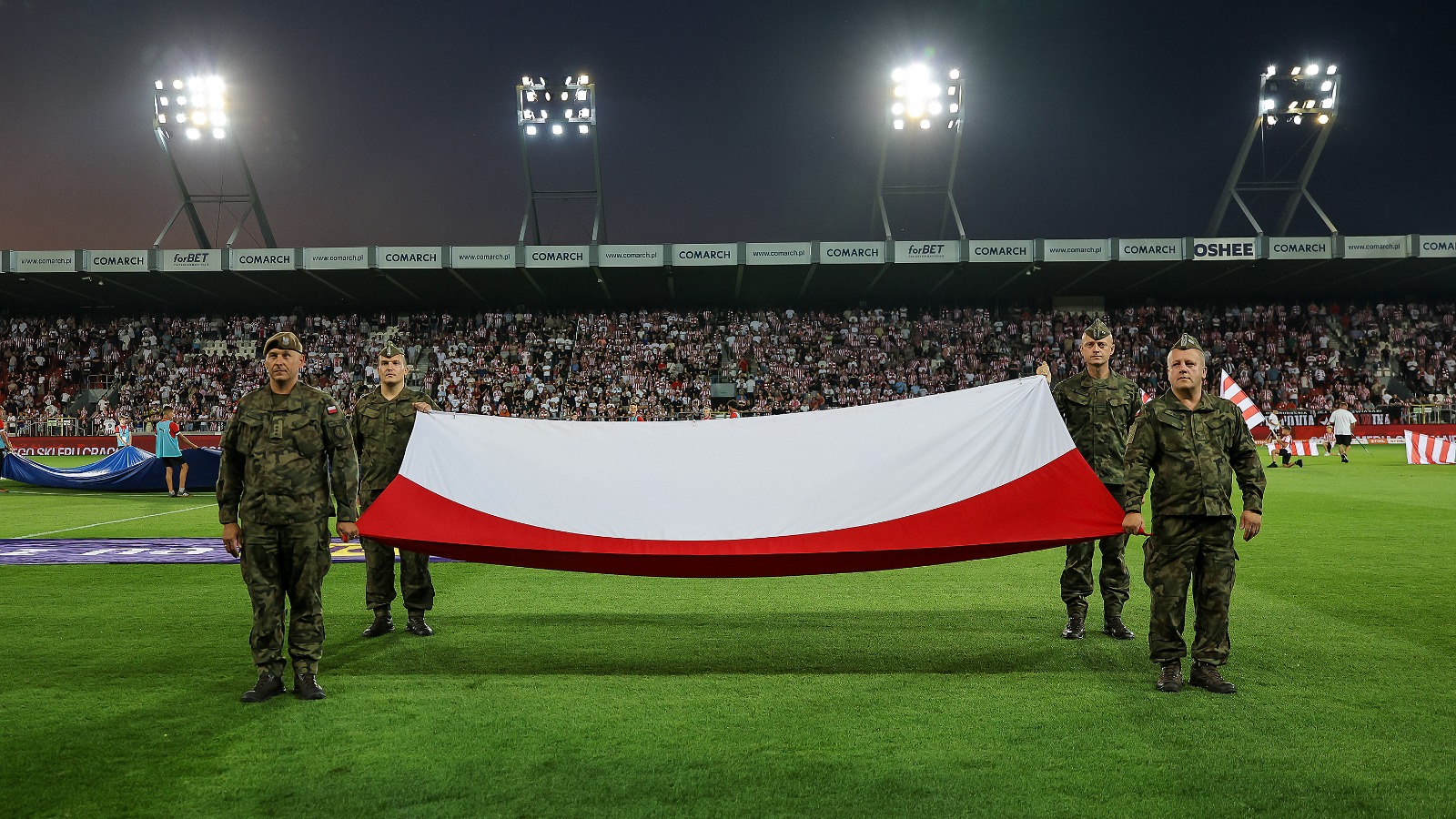 Wprowadzenie barw narodowych i wspólne odśpiewanie hymnu Polski przed rozpoczęciem meczu Cracovii z Widzewem Łódź.