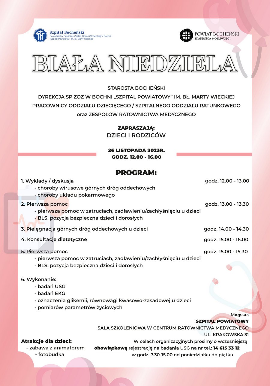 26 listopada 2023 r. w bocheńskim szpitalu odbędzie się „Biała Niedziela”. Ideą tego wydarzenia jest szerzenie profilaktyki chorób wieku dziecięcego z zakresu górnych dróg oddechowych oraz układu pokarmowego, oraz propagowanie zdrowego trybu życia.