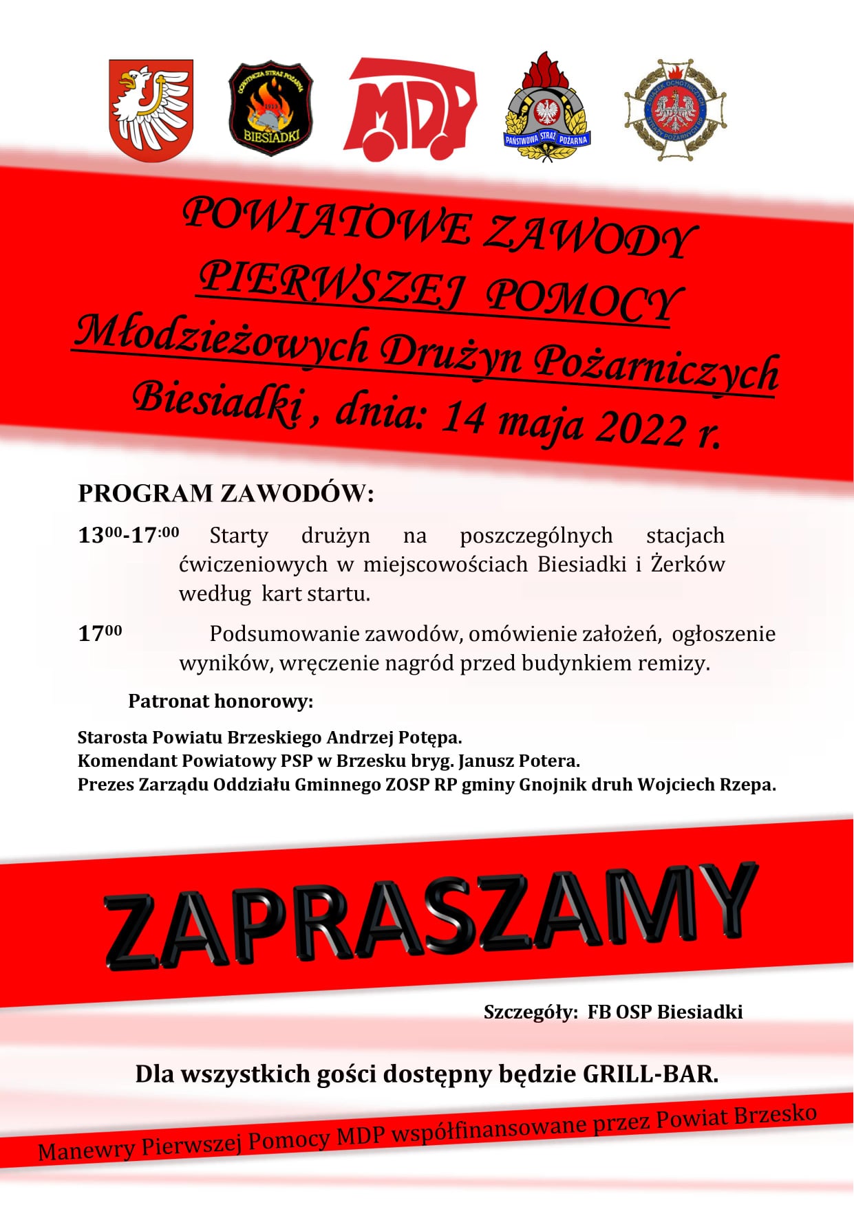 Strażacy z jednostki OSP Biesiadki zapraszają w najbliższą sobotę 14 maja 2022 r. na Powiatowe Zawody Pierwszej Pomocy dedykowane dla Młodzieżowych Drużyn Pożarniczych. W manewrach weźmie udział 12 Młodzieżowych Drużyn Pożarniczych z Gmin Iwkowa, Gnojnik, Borzęcin, Dębno, Szczurowa i Czchów.