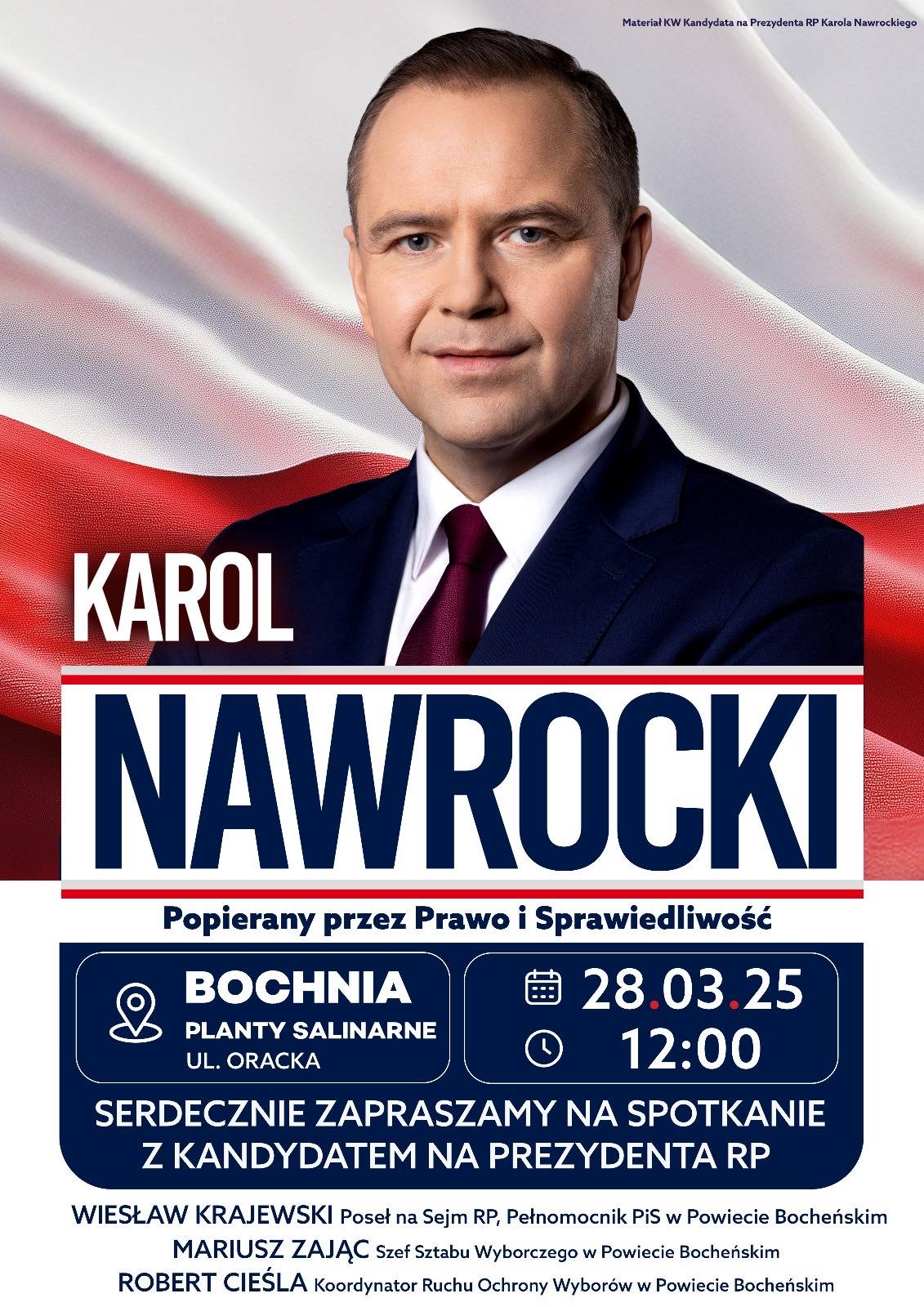 W piątek 28 marca 2025 roku o godzinie 12:00 w Bochni, na Plantach Salinarnych, przy ulicy Orackiej, odbędzie się spotkanie z kandydatem na prezydenta RP, Karolem Nawrockim.