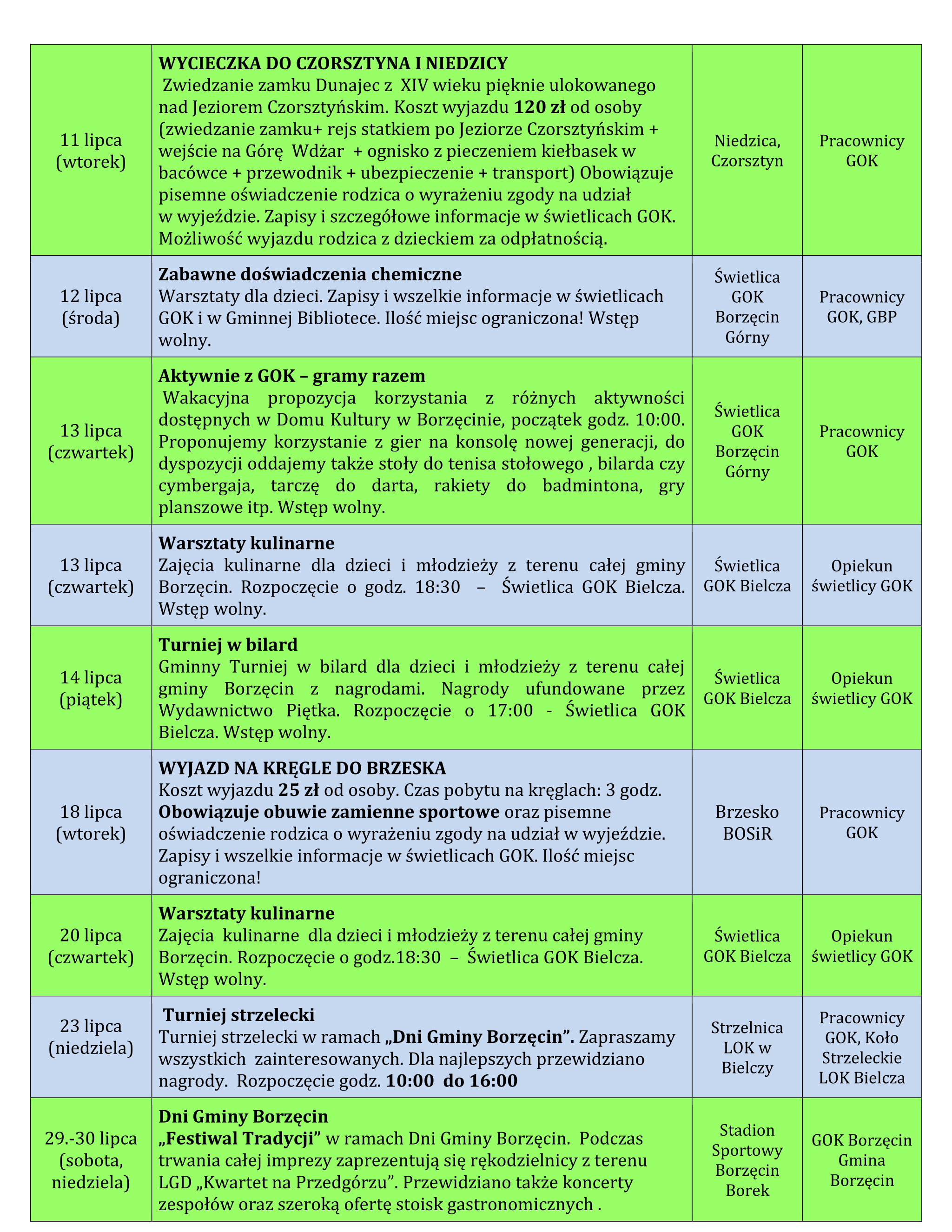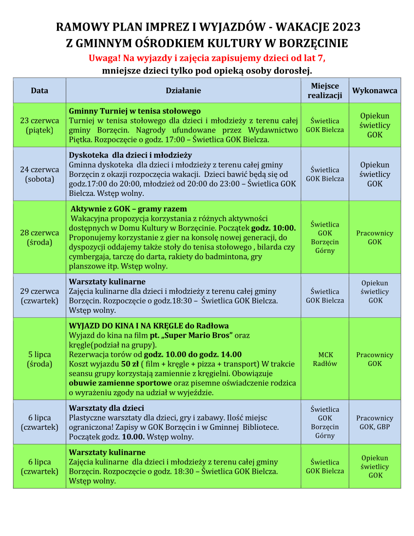 Gminny Ośrodek Kultury w Borzęcinie zaprasza na letnie propozycje zajęć i wyjazdów wakacyjnych. Propozycje skierowane są do dzieci i młodzieży z terenu całej gminy Borzęcin.