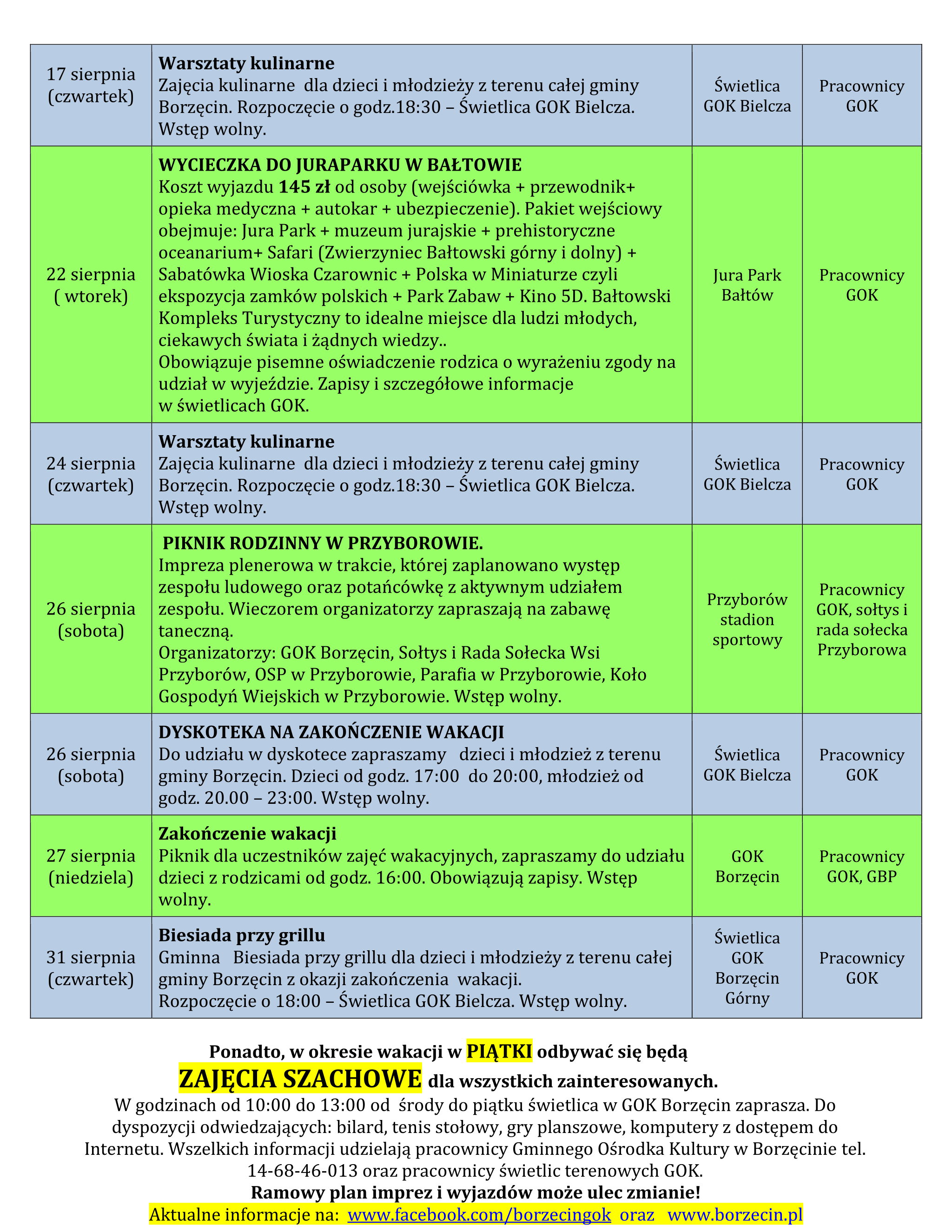 Warunkiem uczestnictwa jest wcześniejsze zapisanie u opiekunów świetlic lub w GOK Borzęcin tel.146846013. Zaplanowane wycieczki są świetną okazją do zabawy i rekreacji ale równocześnie edukacji poprzez zwiedzanie pięknych zakątków Małopolski i nie tylko. Nie zabraknie aktywnego wypoczynku w Parku Wodnym, na kręgielniach i piknikach plenerowych. Fanów dinozaurów, karuzeli zainteresuje wycieczka do Bałtowa oferującego wiele różnorodnych atrakcji.