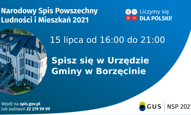 15 lipca 2021r. w godz. 16.00-21.00 w Urzędzie Gminy Borzęcin, rachmistrzowie z terenu gminy Borzęcin będą spisywać wszystkie chętne osoby. Zachęcamy wszystkich którzy jeszcze nie wypełnili obowiązku spisowego, aby skorzystali z punktu spisowego w Urzędzie Gminy Borzęcin.