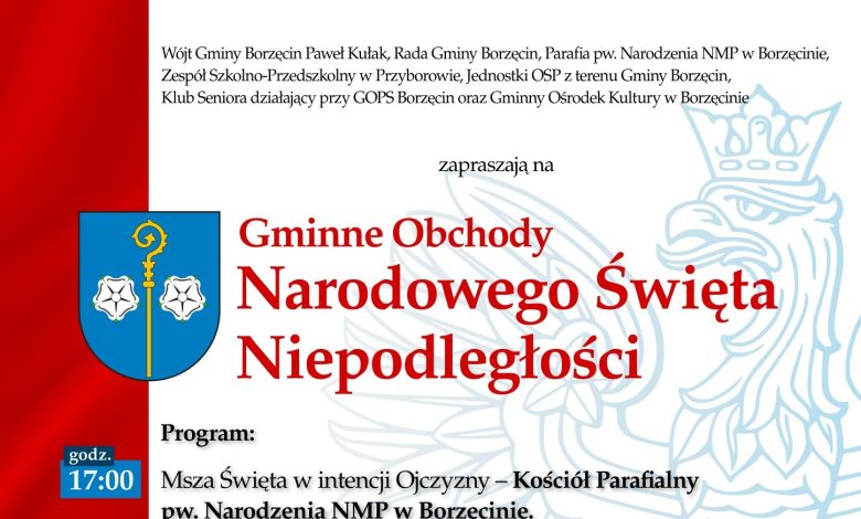 W poniedziałek 11 listopada 2024 roku Gmina Borzęcin zaprasza na uroczystości z okazji Narodowego Święta Niepodległości.