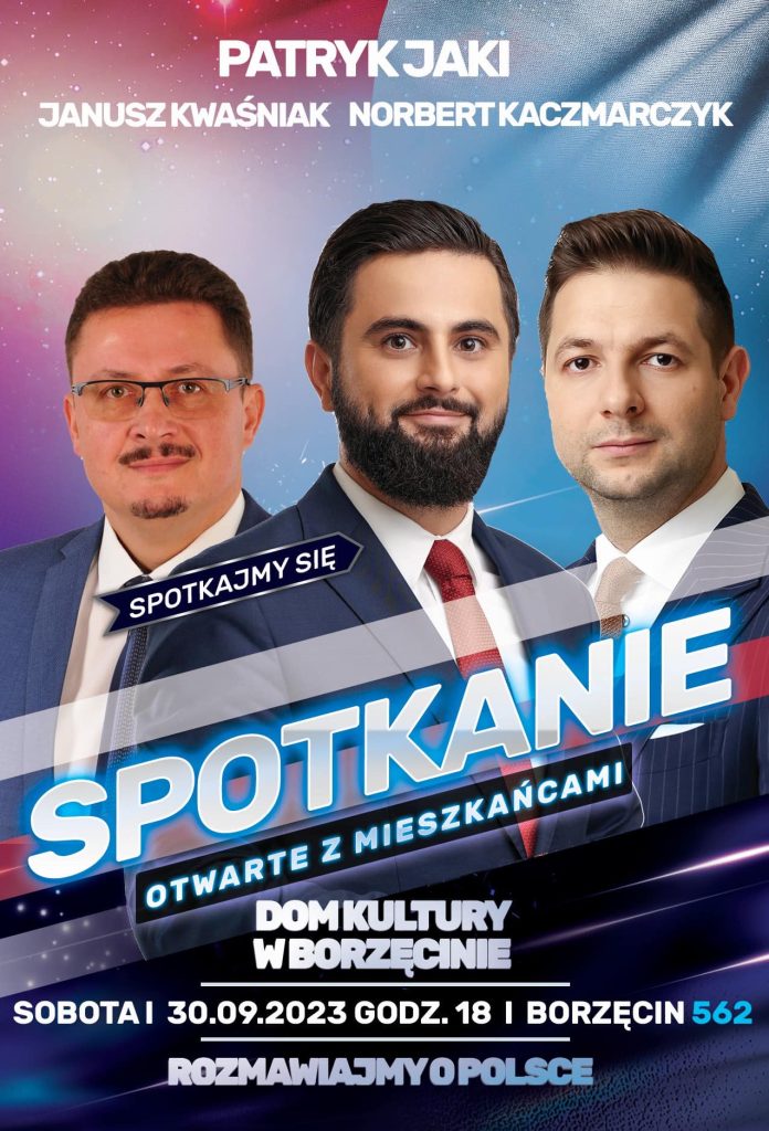w sobotę 30 września 2023 r. w Domu Kultury w Borzęcinie odbędzie się otwarte spotkanie z Patrykiem Jakim – Posłem Parlamentu Europejskiego oraz Norbertem Kaczmarczykiem – Posłem na Sejm RP. Początek spotkania – godz. 18.