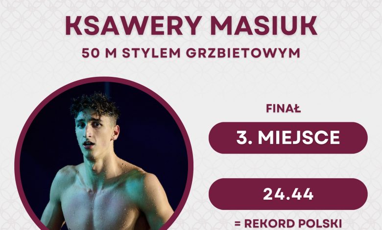 Ksawery Masiuk znalazł się wśród polskich medalistów na pływackich mistrzostwach świata w stolicy Kataru. W niedzielę 18 lutego 2024 r. zdobył brąz w finale 50 metrów stylem grzbietowym. 19-latek z Tarnowa popłynął bardzo dobrze, osiągając czas 24,44. Zwyciężył Australijczyk Isaac Cooper – 24,13, a srebro zdobył Amerykanin Hunter Armstrong – 24,33.