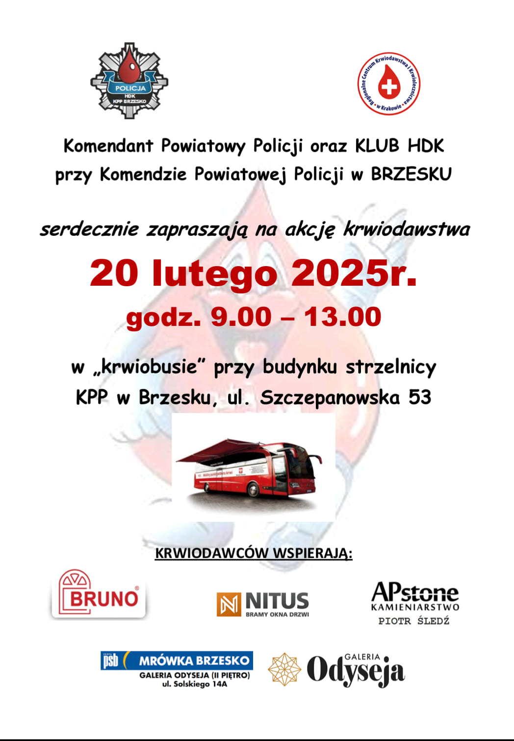 Zbiórka odbędzie się w mobilnym punkcie poboru krwi — „krwiobus” zaparkuje przy budynku strzelnicy Komendy Powiatowej Policji w Brzesku ul. Szczepanowska 53.