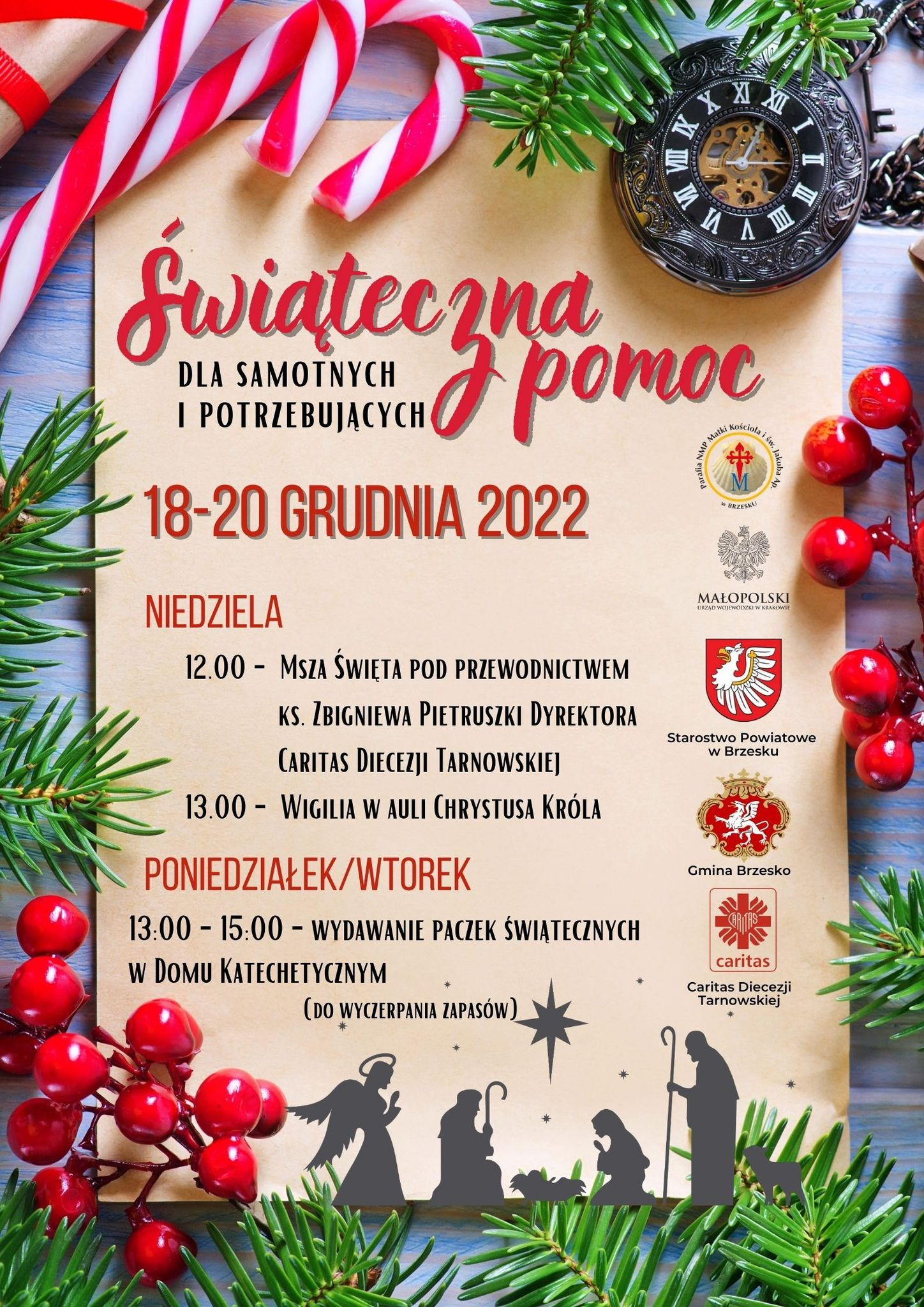 Dzięki wsparciu, jakie parafia Św. Jakuba otrzymała od Małopolskiego Urzędu Marszałkowskiego w Krakowie, wszyscy potrzebujący otrzymają paczki świąteczne, które będą wydawane przez CARITAS w Domu Katechetycznym w poniedziałek i wtorek (19 i 20 grudnia 2022 r.) od godz. 13.00 do 15.00.