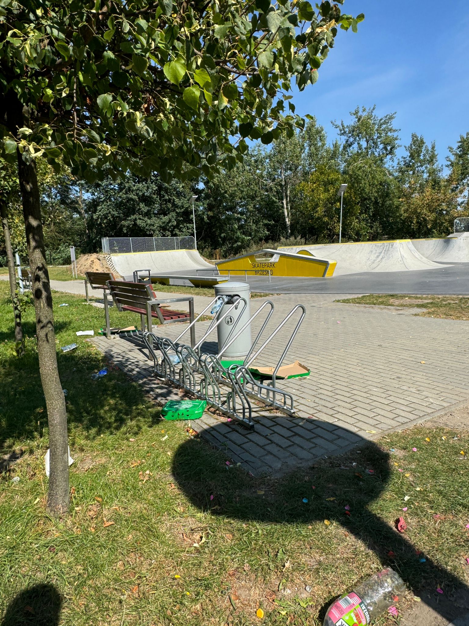 Na zdjęciach widzimy odpady które są rozrzucone w wielu miejscach na terenie skateparku.