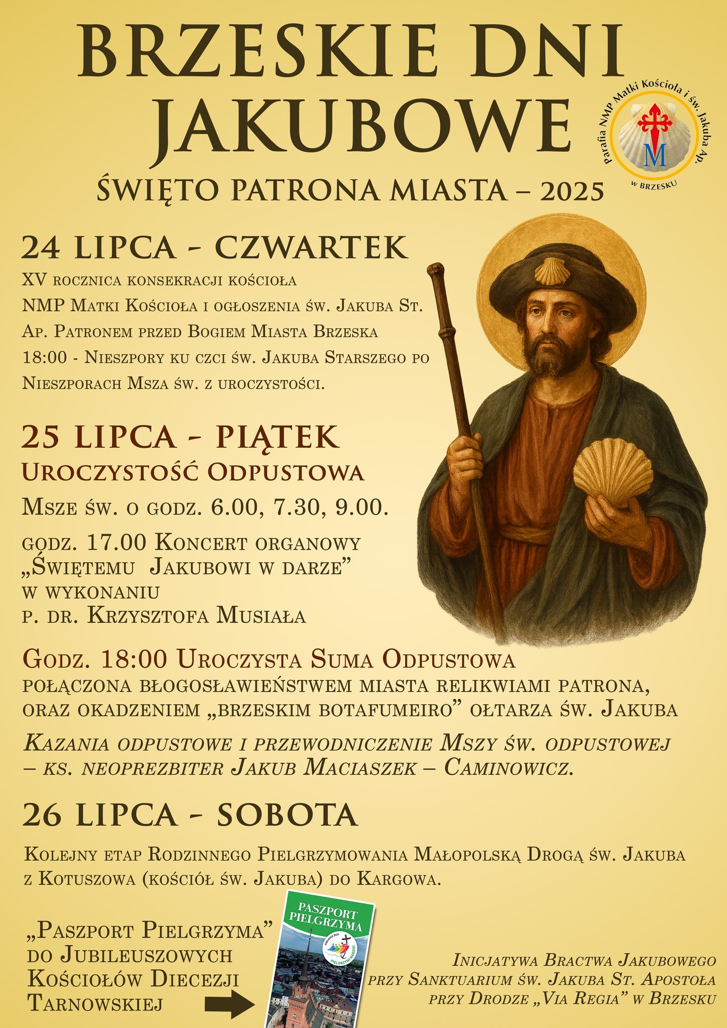 W piątek, 25 lipca 2025 r. główna uroczystość odpustowa w parafii Św. Jakuba oraz święto patrona miasta. O godz. 17.00 odbędzie się w coroczny koncert organowy – „Świętemu Jakubowi w darze” w wykonaniu brzeszczanina doktora Krzysztofa Musiała. Suma odpustowa, połączona z błogosławieństwem Miasta rozpocznie się o godz. 18.00. Kazania będzie głosił i przewodniczył sumie neoprezbiter z Grybowa oraz Caminowicz ks. Jakub Maciaszek. W trym dniu w całym naszym mieście nie obowiązuje post piątkowy.