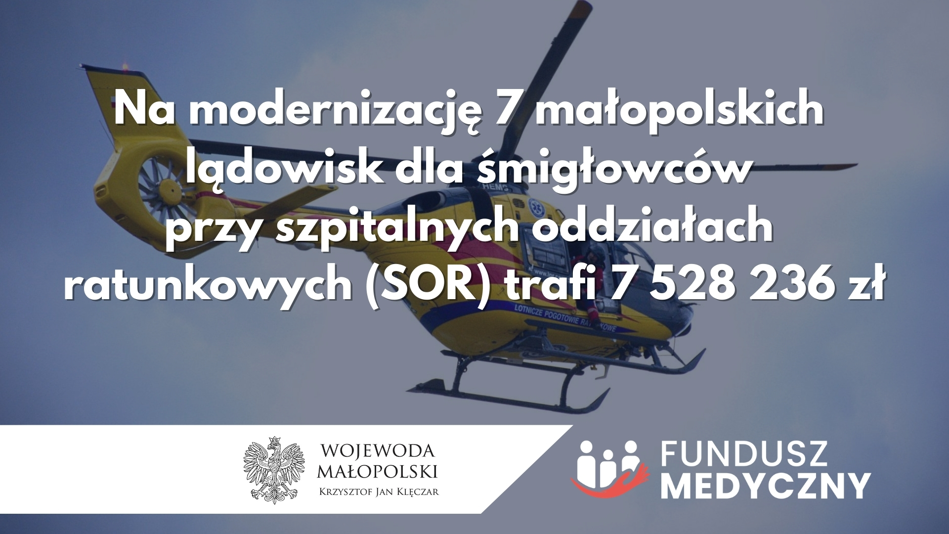 Prawie 23 mln zł trafi do małopolskich podmiotów leczniczych na zadania polegające na budowie albo modernizacji lądowisk dla śmigłowców przy szpitalnych oddziałach ratunkowych (SOR).