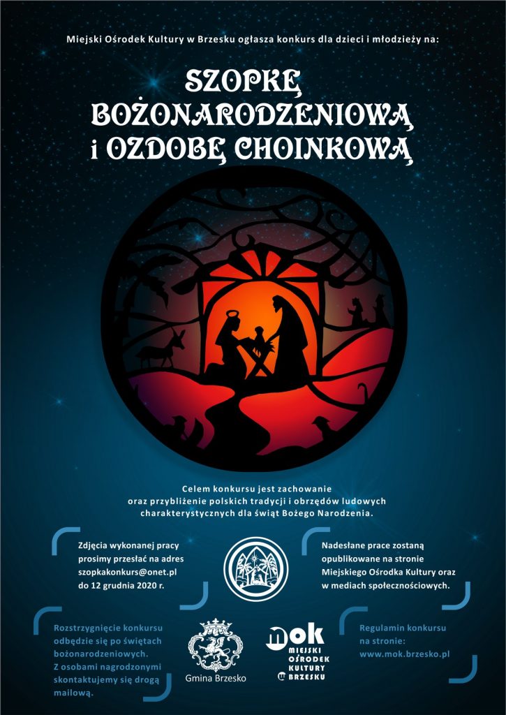 Miejski Ośrodek Kultury w Brzesku zaprasza dzieci i młodzież z terenu Gminy Brzesko do udziału w konkursie plastycznym na najładniejszą na własnoręcznie wykonaną Szopkę Bożonarodzeniową i Ozdobę Choinkową. Celem konkursu jest zachowanie oraz przybliżenie polskich tradycji i obrzędów ludowych charakterystycznych dla świąt Bożego Narodzenia.