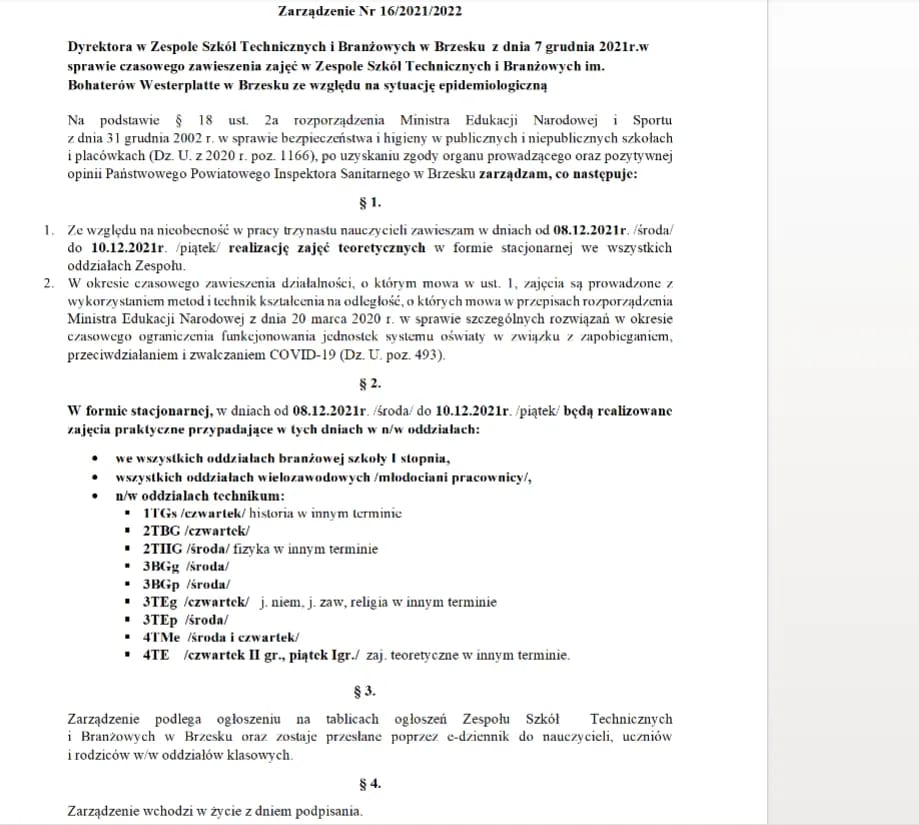 We wtorek 7 grudnia 2021 r. pracownicy oraz uczniowie Zespołu Szkół Technicznych i Branżowych im. Bohaterów Westerplatte w Brzesku otrzymali informację, że w związku z aktualna sytuacją epidemiologiczną, od 8 do 10 grudnia 2021 r. zawieszone zostają zajęcia teoretyczne we wszystkich oddziałach Zespołu Szkół. Powodem zawieszenia zajęć jest nieobecność w pracy aż 13 nauczycieli.