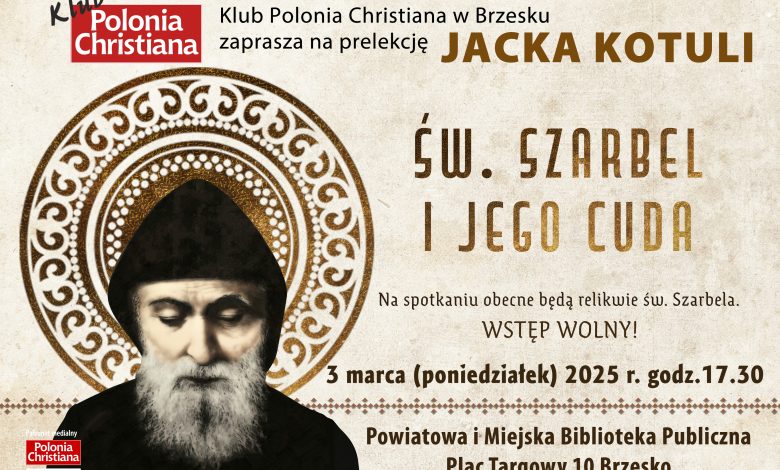 Brzeski klub Polonia Christiana zaprasza na prelekcję na temat życia i cudów św. Szarbela. Prelekcja odbędzie się w najbliższy poniedziałek 3 marca 2025 r. o godz. 17.30 w Regionalnym Centrum Kulturalno Bibliotecznym w Brzesku. Wstęp wolny.