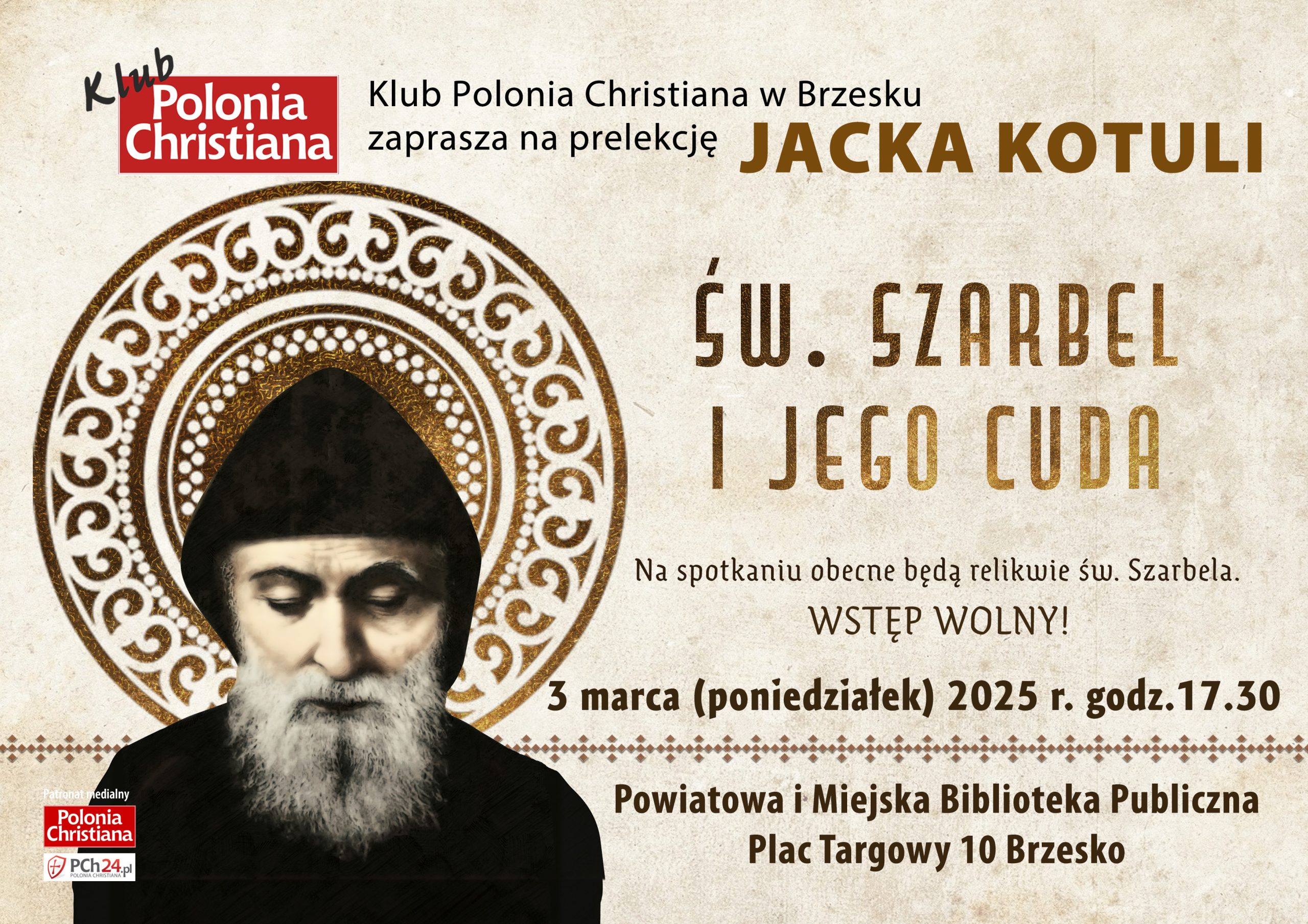 Brzeski klub Polonia Christiana zaprasza na prelekcję na temat życia i cudów św. Szarbela. Prelekcja odbędzie się w najbliższy poniedziałek 3 marca 2025 r. o godz. 17.30 w Regionalnym Centrum Kulturalno Bibliotecznym w Brzesku. Wstęp wolny.
