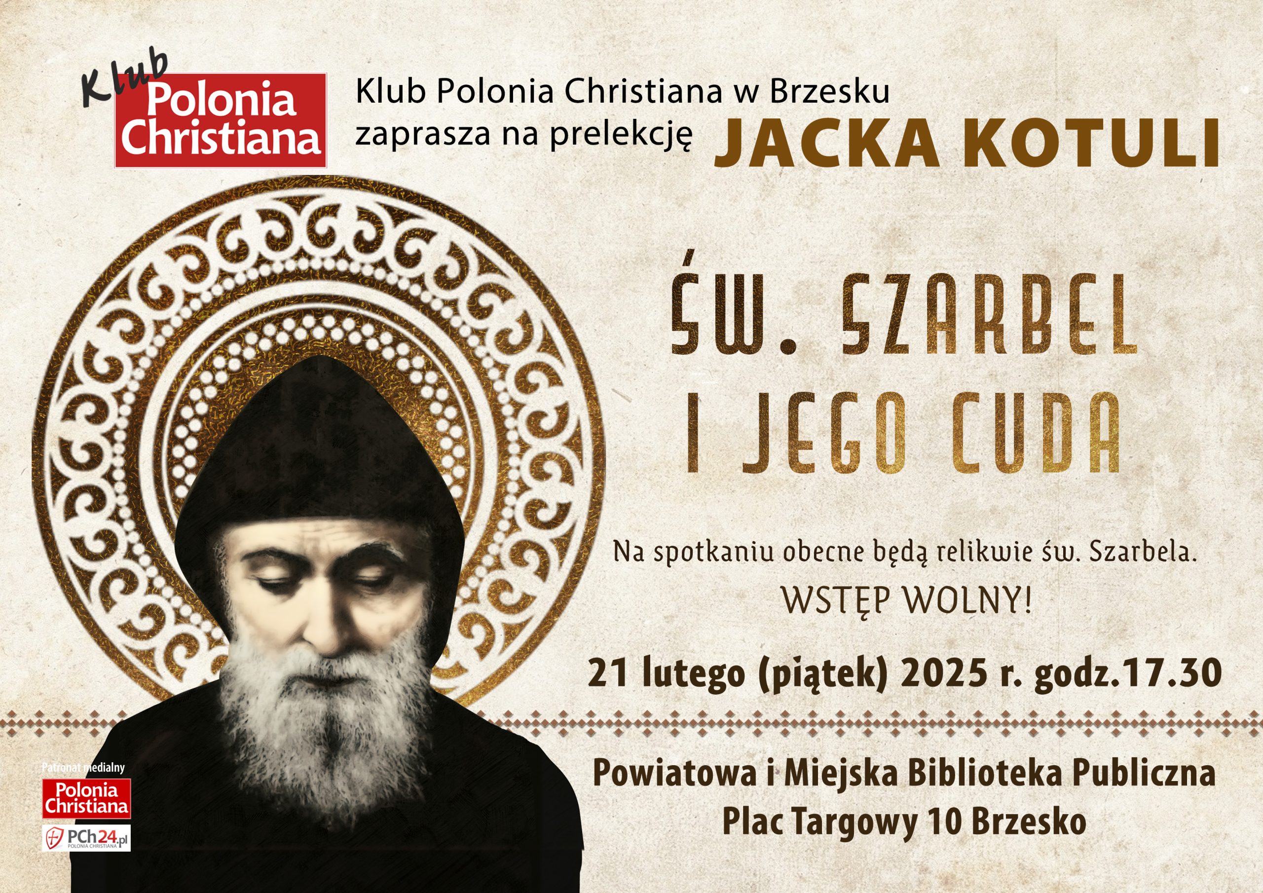 Brzeski klub Polonia Christiana zaprasza na prelekcję na temat życia i cudów św. Szarbela. prelekcja odbędzie się w najbliższy piatek 21 lutego 2025 r. o godz. 17.30 w Regionalnym Centrum Kulturalno Bibliotecznym w Brzesku. Wstęp wolny.