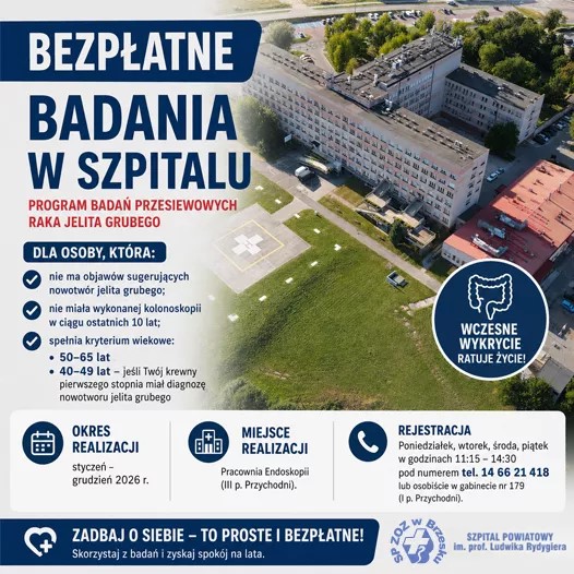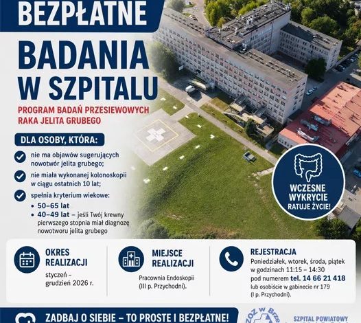 Brzesko jest jedną z trzydziestu placówek w Małopolsce, gdzie można skorzystać z programu badań przesiewowych raka jelita grubego. Badania są bezpłatne i nie wymagają skierowania.