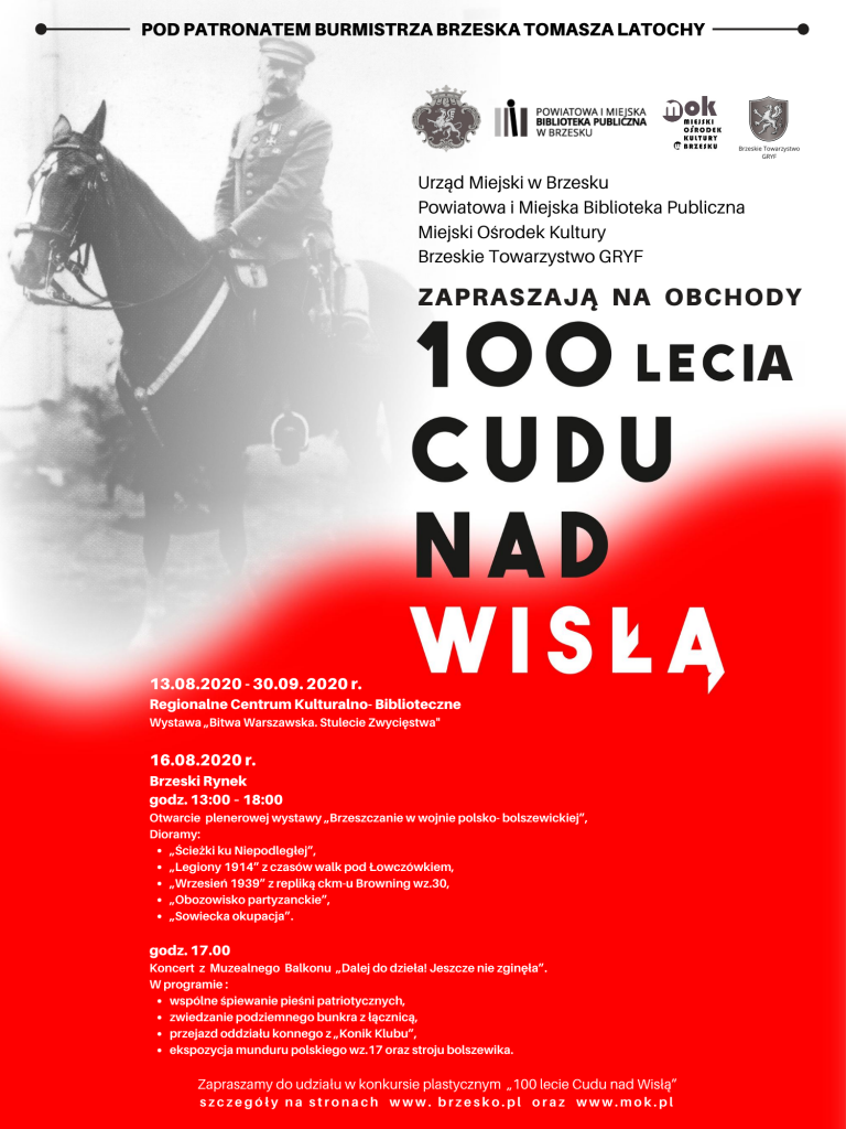 W niedzielę 16 sierpnia 2020 r. na brzeskim rynku odbędzie się wydarzenie mające przypomnieć bohaterskich wydarzeniach jakie były udziałem naszej Ojczyzny przed 100 laty – o wojnie polsko-bolszewickiej oraz o Cudzie nad Wisłą – Bitwie Warszawskiej, jaka rozegrała się w dniach 12.VIII do 25.VIII.1920 roku.