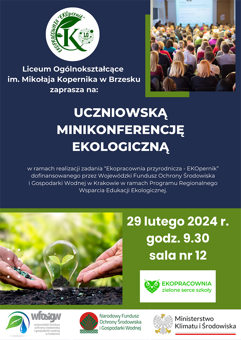 W ramach realizacji zadania „Ekopracownia przyrodnicza – EKOpernik” dofinansowanego przez Wojewódzki Fundusz Ochrony Środowiska i Gospodarki Wodnej w Krakowie w ramach Programu Regionalnego Wsparcia Edukacji Ekologicznej w czwartek 29 lutego 2024 r. w Liceum Ogólnokształcącym im. M. Kopernika w Brzesku odbędzie się Uczniowska Minikonferencja Ekologiczna przygotowana przez uczniów klas biologiczno – chemicznych.