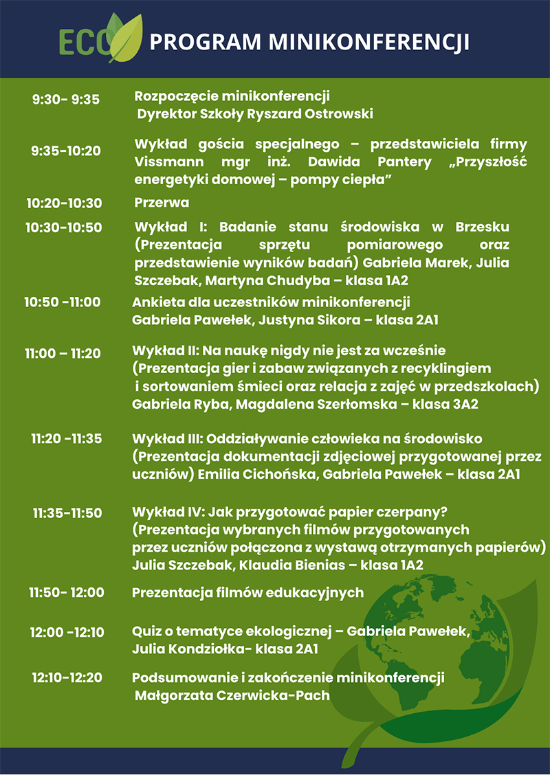 | 12:00 – 12:10 | Quiz o tematyce ekologicznej – Gabriela Pawełek, Julia Kondziołka- klasa 2A1 |