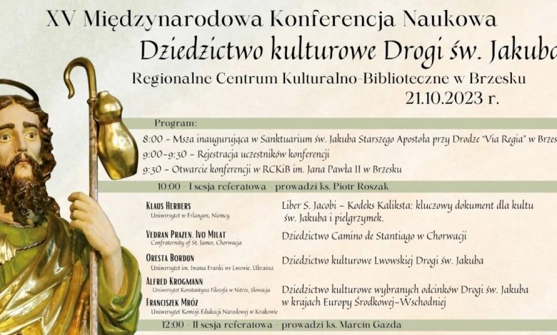 Parafia Św. Jakuba w Brzesku zaprasza w sobotę 21 października 2023 r. do Regionalnego Centrum Kulturalno-Bibliotecznego w Brzesku, gdzie odbędzie się XV Międzynarodowa Konferencja Naukowa – Dziedzictwo kulturowe Drogi św. Jakuba.