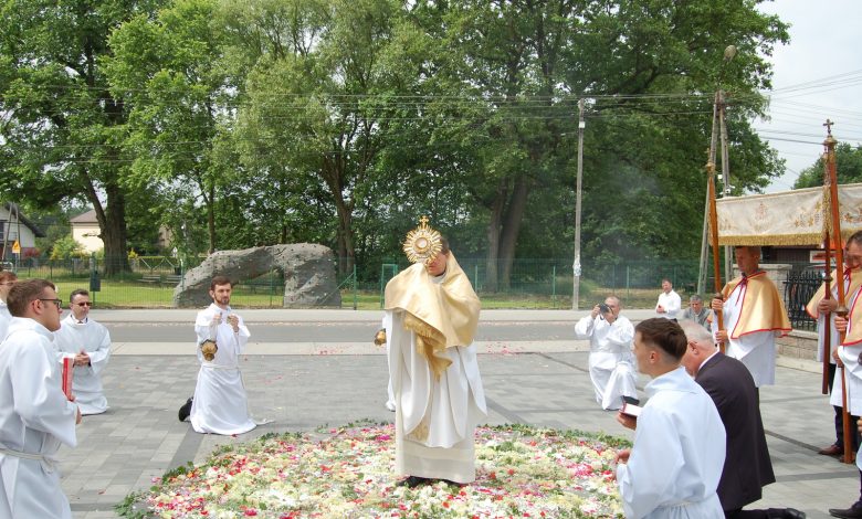 W galerii zdjęć, na drodze procesji możemy dostrzec kwietny dywan przygotowany na placu przed kościołem parafialnym. Tradycja tworzenia kwietnych dywanów jest popularna w wielu parafiach w centralnej i zachodniej Polsce.