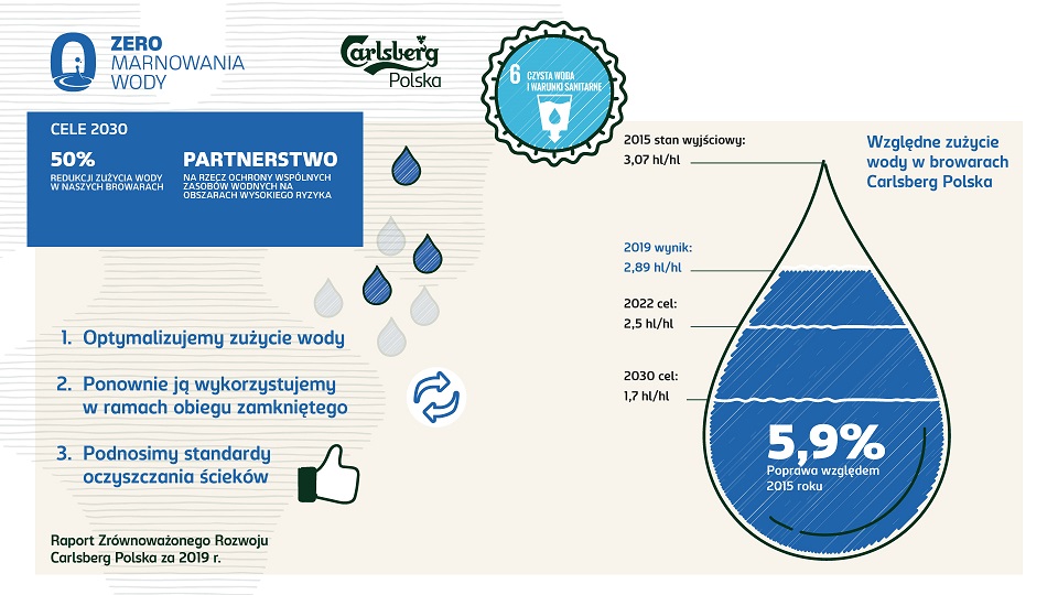 Ambicją Grupy Carlsberg jest ograniczenie zużycia wody z 3,4 hl wody na 1 hl gotowego piwa (dane bazowe z 2015 r.) do 1,7 hl /hl do roku 2030. Carlsberg Polska aktywnie uczestniczy w realizacji tego celu. Monitorowanie i redukowanie zużycia wody, inwestycje w browarach i wdrażane innowacje, pozwalają efektywnie nią gospodarować i tam, gdzie to możliwe, wykorzystywać ponownie, np. na linii pakowania do zraszania puszek po nalewie, aby oczyścić je z piany.