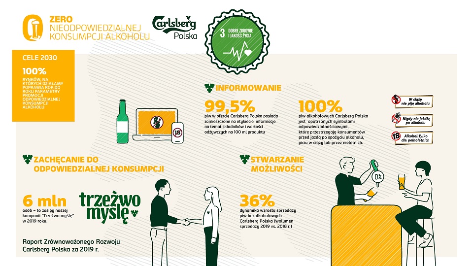 Carlsberg Polska wspiera konsumentów i społeczeństwo w odpowiedzialnej konsumpcji alkoholu na trzy sposoby – zapewniając z roku na rok szersze portfolio wariantów bezalkoholowych – w 2019 r. było ich w ofercie 7 (w tym 4 nowości), edukując oraz zachęcając do dokonywania odpowiedzialnych wyborów. Jednym z kluczowych działań w tym obszarze jest kampania społeczna pod hasłem „Trzeźwo myślę”. W 2019 r.z przekazem edukacyjnym kampanii zapoznało się ok. 6 mln odbiorców.