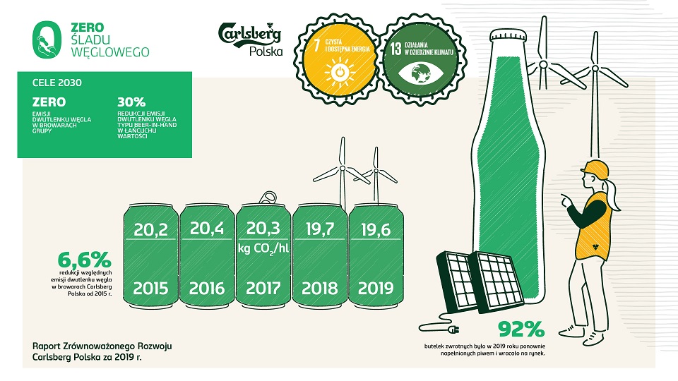 Grupa Carlsberg dąży do osiągnięcia neutralności klimatycznej w swoich browarach do roku 2030 i ograniczenia o 30% emisji CO2 w łańcuchu wartości (tzw. emisji „beer-in-hand”) względem bazowego roku 2015. To zobowiązanie wpisuje się w cele Porozumienia Paryskiego z 2015 r. – ograniczenia globalnego wzrostu temperatury o 1,5°C.